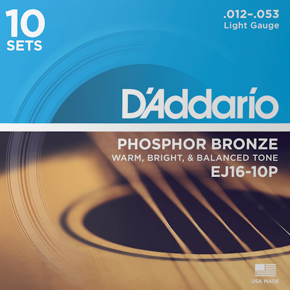 D'Addario was the first to use Phosphor Bronze in acoustic guitar strings back in 1974. Today, Phosphor Bronze is played throughout the world and considered to be the standard in acoustic strings, thanks to its beautiful sonic balance and tonal warmth. Our pioneering Phosphor Bronze acoustic guitar strings are precision wound with phosphor bronze wrap wire over a high-carbon steel core, providing tonal versatility suitable for all acoustic styles and musical genres. 12-53 Light gauge strings are our most popular acoustic gauge, providing a nice balance of playability and tone.