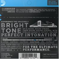 EJ21, D'Addario's most popular round wound "jazz" set, features a wound 3rd/G string for greater resonance and a tighter feel. Can also be used for down tuning.