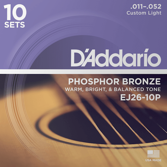D'Addario was the first to use Phosphor Bronze in acoustic guitar strings back in 1974. Today, Phosphor Bronze is played throughout the world and considered to be the standard in acoustic strings, thanks to its beautiful sonic balance and tonal warmth. Our pioneering Phosphor Bronze acoustic guitar strings are precision wound with phosphor bronze wrap wire over a high-carbon steel core, providing tonal versatility suitable for all acoustic styles and musical genres. These 11-52 Custom Light gauge strings have slightly more volume and projection than Extra Light, while still being easy to play.