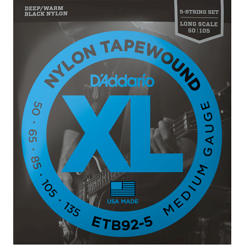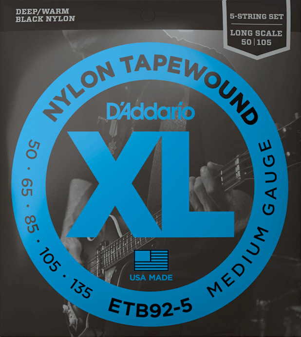 XL Nylon Tapewound bass strings are the warmest, smoothest bass strings we have to offer. Great for fretted or fretless instruments, these flat wound, silky smooth strings have a distinctively warm, percussive tone, with no finger noise. Made with a high carbon steel core and wrapped in flattened black nylon, our Tapewound strings are polished to an ultra-smooth finish, delivering unrivaled punch, depth, and focus. Made for 5-string long scale basses, this 50-105 Medium set has a higher tension, affording increased low-end response and output.