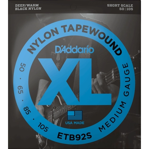 XL Nylon Tapewound bass strings are the warmest, smoothest bass strings we have to offer. Great for fretted or fretless instruments, these flat wound, silky smooth strings have a distinctively warm, percussive tone, with no finger noise. Made with a high carbon steel core and wrapped in flattened black nylon, our Tapewound strings are polished to an ultra-smooth finish, delivering unrivaled punch, depth, and focus. Made for short scale basses, this 50-105 Medium set has a higher tension, affording increased low-end response and output.