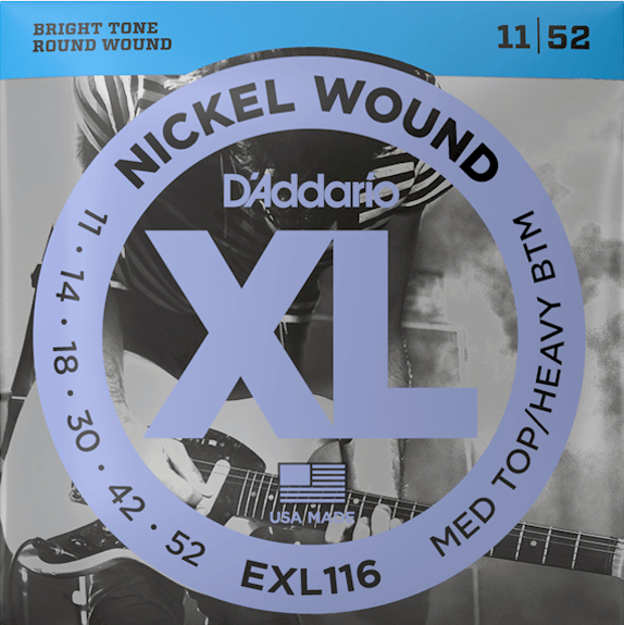 EXL116 is a hybrid set with an .011 on top and a .052 on the bottom, giving the strings moderate flexibility on the high strings with booming, tight low end. Optimized for down tuning.