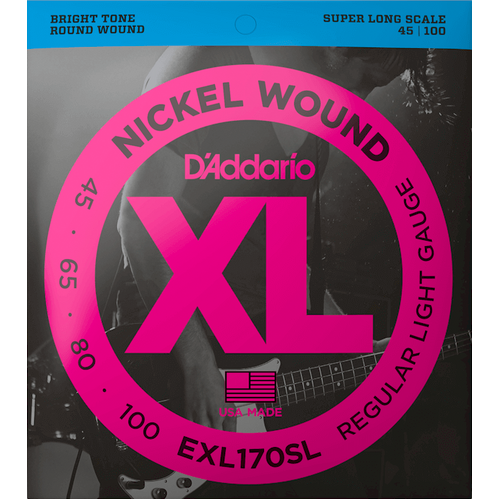 XL Nickel are the industry standard in electric bass strings. With their clear fundamentals, booming tight lows, and reliable D’Addario construction, they’re trusted by players everywhere to handle any performance. XL Nickel bass strings are made with a high carbon steel core and wound with nickel-plated steel wrap wire, for consistently bright tone and smooth playability, great for a wide variety of bass styles. This 45-100 Regular Light set is the super long scale version our most popular gauge, providing a perfect blend of response and playability.