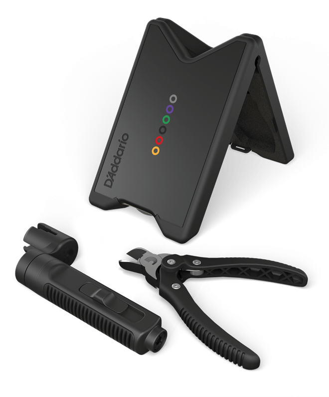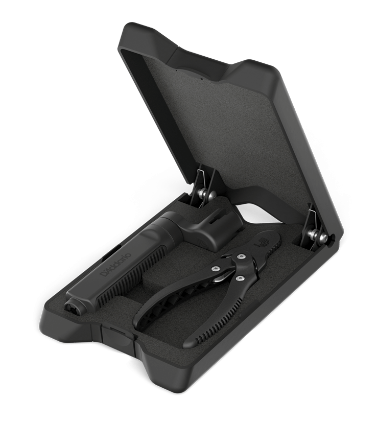 The D'Addario Tour-Grade String Change Kit promises professional string changes in any environment. The string winder utilizes a premium ball bearing socket to easily turn any tuning peg and features a collet design bridge pin puller that captures bridge pins as you remove them. The string cutter features long-lasting hardened blades and compound-action design to provide over seven times the cutting force of standard pliers, making it easy to get through even the thickest strings with ease. Both tools come in a durable, over-molded case, which doubles as a neck rest, so players, luthiers, and techs have everything they need to change strings like a pro.F