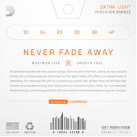 D'Addario XS Acoustic Phosphor Bronze combines our most popular acoustic alloy with our most advanced string coating technology, resulting in clear tone, smooth feel, and superior tuning stability — all with the longest possible string life. Available in Phosphor Bronze for 6 and 12-string acoustic guitar, ranging from extra-light to medium gauges.