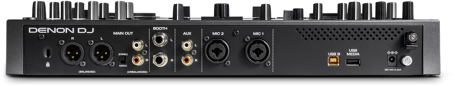 Professional inputs and outputs (balanced XLR main out, RCA out, ¼” booth out, RCA aux input, 2 balanced Mic combo jack inputs)