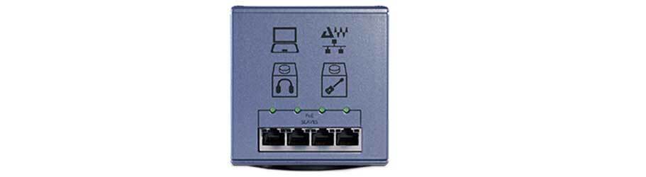 It features one upstream (non-PoE) port, and four downstream PoE ports, which allows connection to four further DiGiGrid devices. [S] is also Dante compatible
