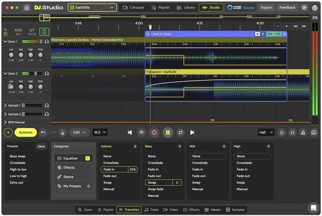 Default and custom transition presets, with curves for volume, EQ, and effects.