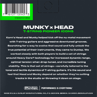 Korn’s Head and Munky helped kick off the nu-metal movement with 7-string guitars and aggressive downtuned grooves. Searching for a way to evolve that sound and fully unlock the true potential of their instruments, they came to Dunlop. We worked closely with both players to build a set of strings around Heavy Core technology for increased dynamic range, optimal tension when drop-tuned, and and incredible tuning stability. This is that set of strings—carefully tailored to the tonal and tactile dynamics of 7-string guitars. Each set includes a custom-print Tortex® Pick—the very same one that Head and Munky use to dig in after stringing up.