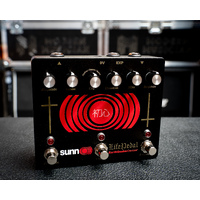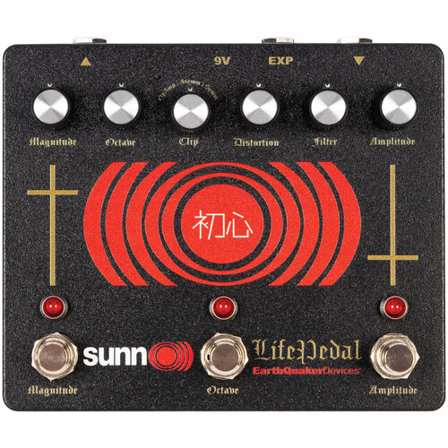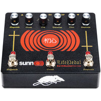 The Octave in Sunn O))) Life Pedal V3 is an all-discrete, analog full-wave rectifier base on a classic vintage design. Located at the input of the circuit, the Octave control slowly blends in the octave effects as you turn it clockwise. This feature can also be used via expression control allowing for wild, hands-free octave swells mid-riff or using the footswitch for immediate octave fuzz destruction. Because this is an analog octave effect, it is monophonic and works best playing single notes above the twelfth fret while using the neck pickup. Playing chords with the analog octave will sound clanging and chaotic. Using the bridge pickup and playing below the twelfth fret will produce a very subtle octave effect. Going full Octave transforms Life Pedal from a simple distortion device into a swelling, raging fuzz similar to the classic Super Fuzz!