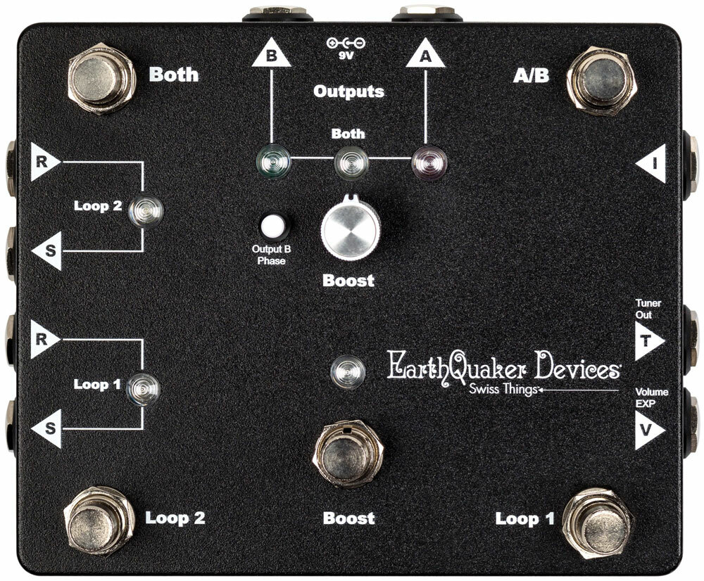 Swiss Things® combines two true-bypass Flexi-Switch® enabled effects loops, a Flexi-Switch® AB-Y box with transformer isolation between outputs, a buffered tuner output, 20dB of clean boost with adjustable gain, an expression pedal output for volume control and a quiet, high headroom output buffer into a compact pedalboard-friendly signal routing junction box that lives at the top-right corner of your pedalboard and really ties your rig together without any signal loss.