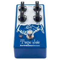 The Tone Job has active EQ controls for Bass, Mid and Treble, with up to 20 dB of cut or boost, which is handy for pairing up with other pedals in your chain to breathe new life into old dirt. Unlike boring old graphic EQs, the Tone Job’s EQ controls are interactive, so you can experiment with different settings to alter the response and overall feel of the device, getting your tone out of the lunchroom and back on the clock.