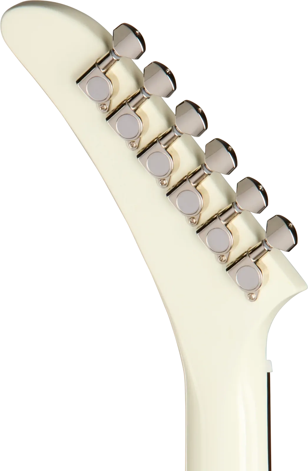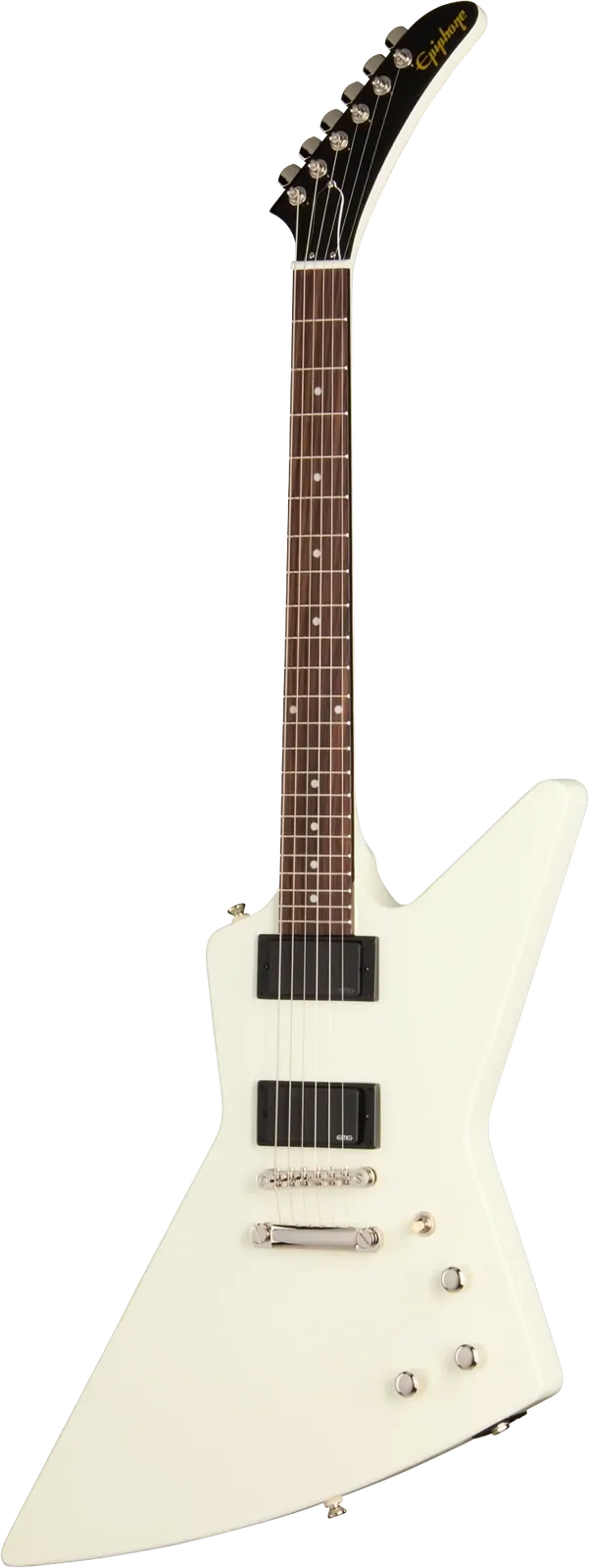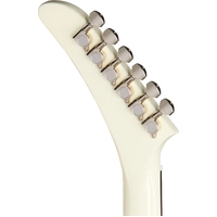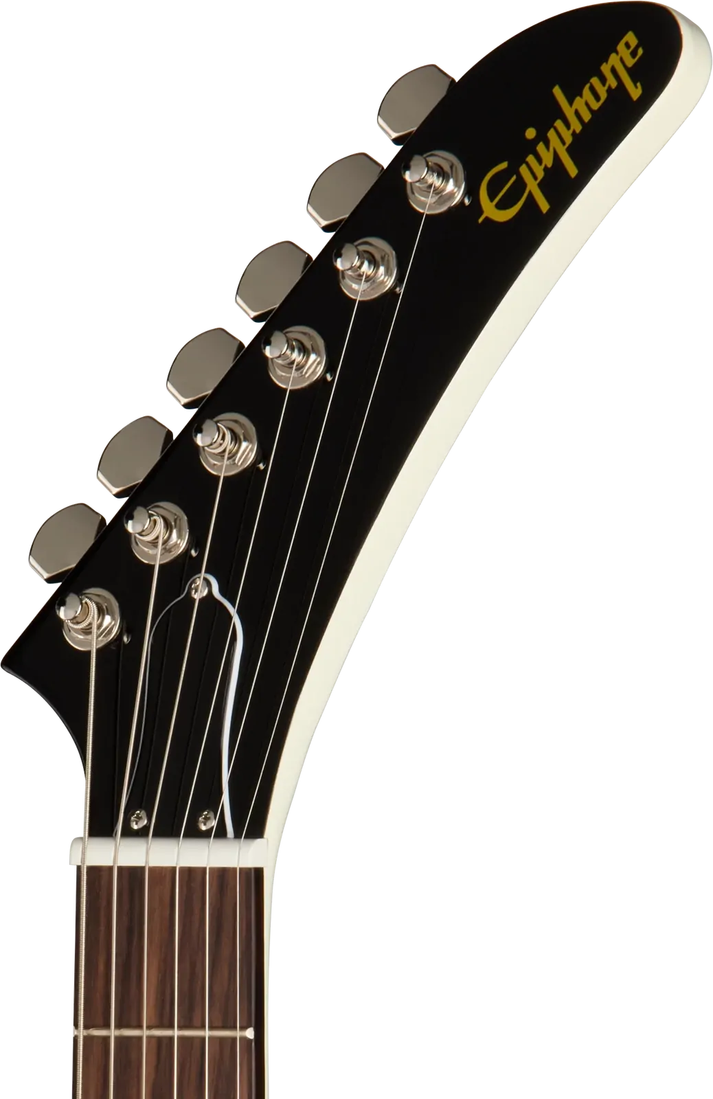 Explorer headstock with mini die cast tuners and Epiphone logo in gold silkscreen