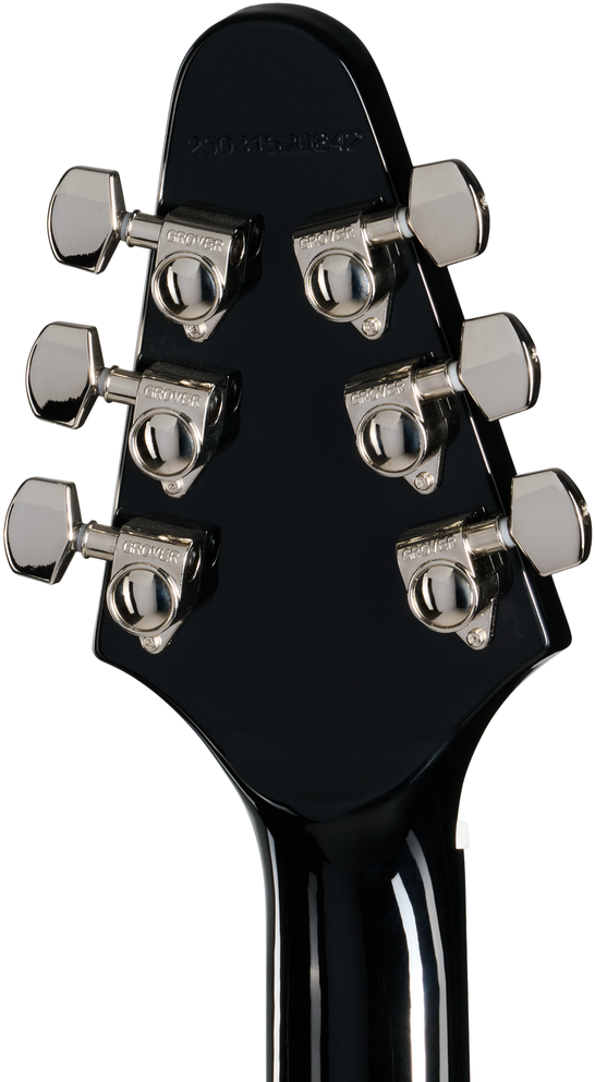The Epiphone Flying V 70s features a two-piece, center-seamed mahogany body that is sure to turn heads. The mahogany neck has a comfortable, Rounded C profile and a volute at the neck/headstock junction, just like the vintage models from the 70s. The neck is topped with an ebony fretboard that features 22 medium jumbo frets and simple pearloid dot inlays. The slightly shorter 70s-era arrowhead-shaped headstock is equipped with Grover® Rotomatic® tuners with spade buttons and a Graph Tech® nut, ensuring solid tuning stability. The other ends of the strings pass over an Epiphone LockTone™ Tune-O-Matic™ bridge and are anchored with a LockTone Stop Bar tailpiece. The iconically shaped mahogany body is outfitted with Epiphone’s new T-Type PRO™ humbucking pickups. They accurately capture the unique, fat-toned sound and rich sustain of the Flying V models that many players preferred during that era. The pickups are wired to individual volume controls and a master tone control; the controls are capped with Witch Hat control knobs. Other era-correct details are present, including a 70s-style Flying V pickguard and a 70s-style truss rod cover with the Epiphone logo hotstamped on it.