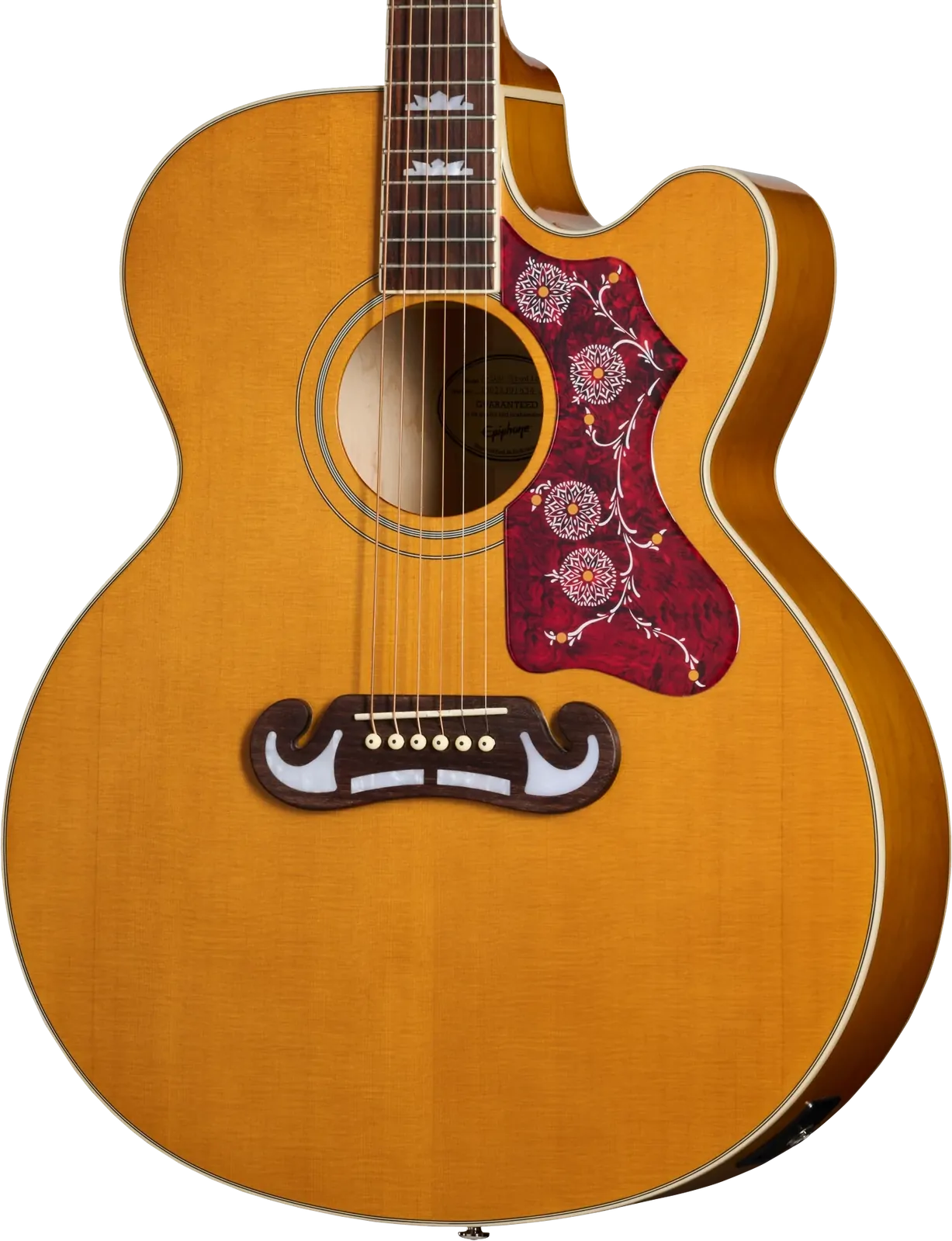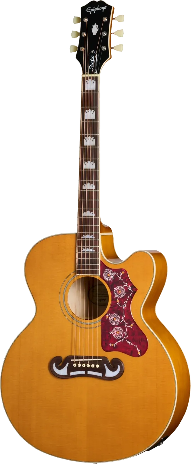 The Epiphone J-200™ Studio EC is part of the all-new Epiphone Studio Acoustic Collection. These guitars have been completely reimagined to offer the most authentic and affordable acoustic guitars inspired by iconic Gibson designs. The J-200 Studio EC offers a blend of classic design and modern functionality and was designed to appeal equally to beginners and seasoned players alike. The Epiphone J-200 Studio EC acoustic guitar is a distinguished model, celebrated for its Super Jumbo body and remarkable sound projection. Inspired by the legendary Gibson SJ-200, “The King of the Flat-Tops,” this guitar boasts a cutaway for improved access to the upper frets. The J-200 Studio EC has a layered maple body with four-ply binding on the top, single-ply binding on the back, fretboard, and headstock, and a solid spruce top for a responsive, balanced tone with excellent dynamic range that will sound even better with the passage of time. The mahogany neck is joined to the body with a glued-in tapered dovetail neck-to-body joint and has a 1960s SlimTaper™ D profile that makes it comfortable to play. The neck is capped with a rosewood fretboard equipped with 20 standard frets and adorned with pearloid graduated crown inlays. The other ends of the strings are routed over a compensated plastic saddle and are anchored to the Moustache™ rosewood bridge with ivory with black dot bridge pins. The Moustache bridge is decorated with four pearloid inlays.