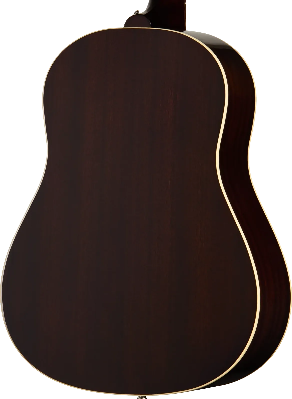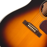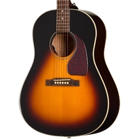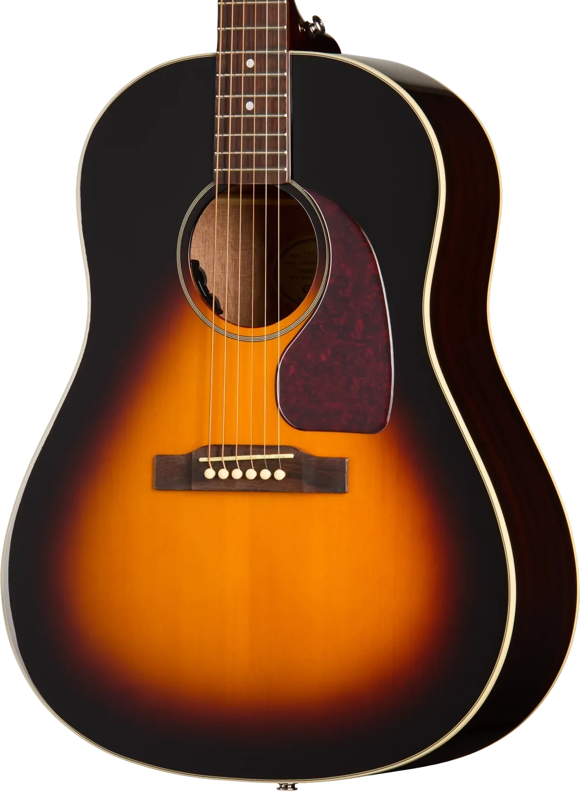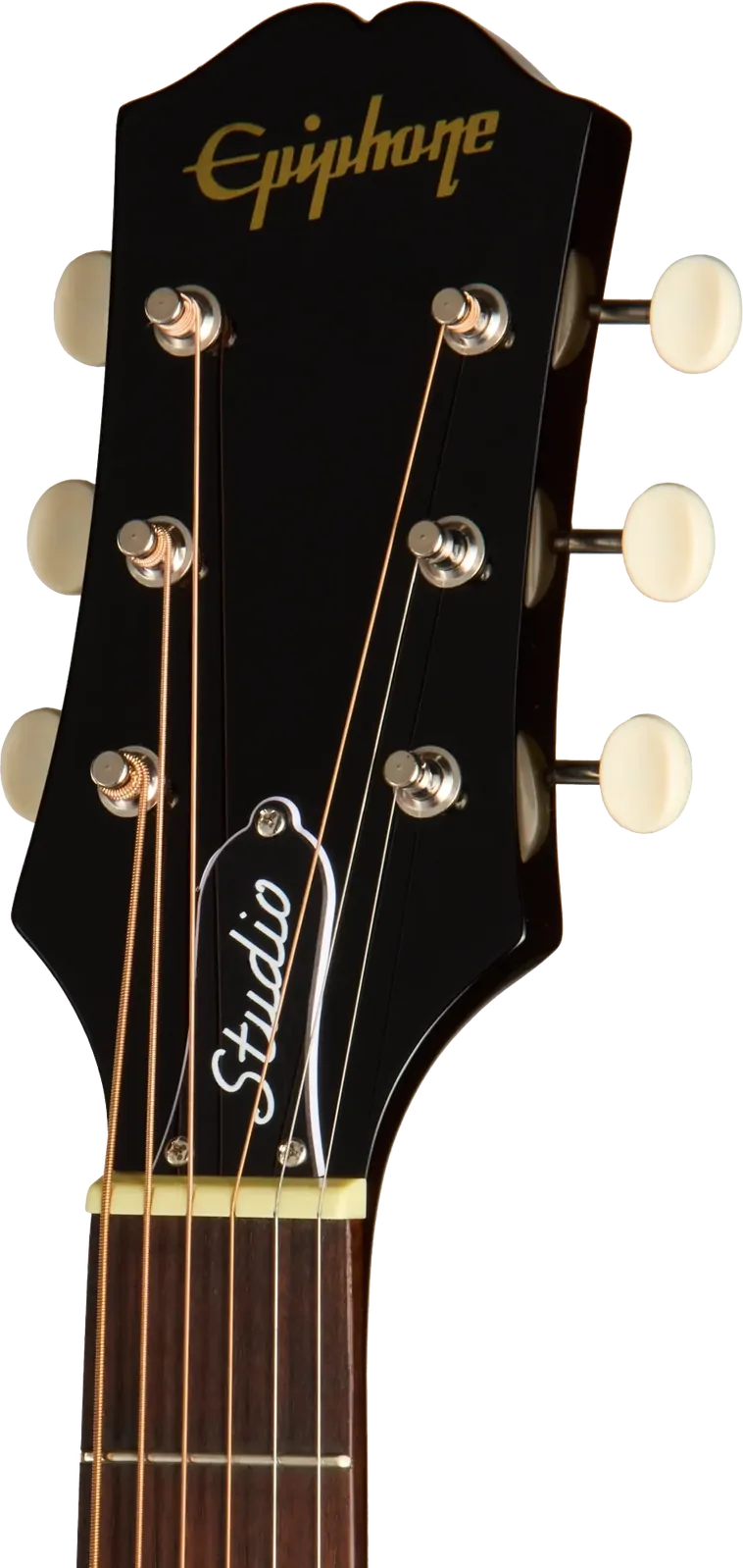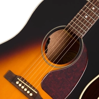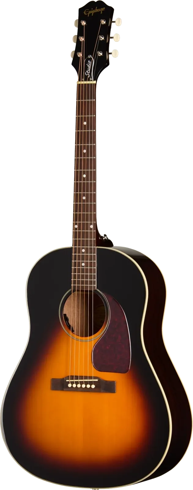 The Epiphone J-45™ Studio is part of the all-new Epiphone Studio Acoustic Collection. These guitars have been completely reimagined to offer the most authentic and affordable acoustic guitars inspired by iconic Gibson designs. The J-45 Studio offers a blend of classic design and modern functionality and was designed to appeal equally to beginners and seasoned players alike. Based on the classic Gibson J-45 “The Workhorse,” the J-45 Studio has a sloped shoulder body and 24.75” scale length, just like the Gibson model that inspired it. The J-45 Studio delivers a warm, rich tone with exceptional clarity, making it ideal for a wide range of musical styles. The J-45 Studio has a layered mahogany body with four-ply ivory and black binding on the top, single-ply ivory binding on the back, and a solid spruce top for a responsive, balanced tone with excellent dynamic range that will sound even better as it ages. The mahogany neck is joined to the body with a glued-in tapered dovetail neck-to-body joint and features a Rounded C profile that ensures comfortable playability. The neck is topped with a rosewood fretboard equipped with 20 standard frets and dressed up with simple pearloid dot inlays. The other ends of the strings are routed over a compensated plastic saddle and are anchored to the belly-up rosewood bridge with ivory-colored bridge pins. We also included other details that give the J-45 Studio even more vintage-style visual appeal, including a teardrop-shaped dark tortoise shell-colored pickguard, three-on-a-plate tuners with ivory-colored plastic buttons, and a 60s Kalamazoo-style headstock with the Epiphone logo proudly displayed in gold silkscreen. The J-45 Studio comes with Fishman electronics, including an S-Core under-saddle pickup and Fishman Presys VT preamp with soundhole-mounted volume and tone controls that are fast and easy to access for the player while remaining nearly invisible to the audience. The Epiphone J-45 Studio has a gloss finish and is offered in two vintage-inspired colors—Natural and Vintage Sunburst. Both right and left-handed versions are available. A standard gig bag is also included.