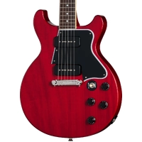 Now, Epiphone is proud to introduce the Les Paul Special Double Cut, an Inspired by Gibson recreation of those early 60s models. It features a slab mahogany double-cutaway body, providing unfettered access to the entire length of the fretboard. The glued-in mahogany neck features a 60s SlimTaper profile and is fitted with a bound rosewood fretboard that boasts 22 medium jumbo frets and pearloid dot position markers. The 1960s Kalamazoo headstock is equipped with Epiphone three-on-a-plate tuners featuring ivory buttons and a Graph Tech nut for solid tuning stability and undeniable vintage appeal. The Epiphone logo is inlaid in mother-of-pearl. The strings are anchored at the other end with an Epiphone Lightning Bar compensated wraparound bridge that bolts directly into the body for enhanced sustain and resonance. The Les Paul Special Double Cut is powered by a pair of Epiphone P-90 PRO™ single-coil Soapbar pickups, which deliver everything from sweet, sparkling cleans to mean, fiery, distorted tones. Each pickup is wired to individual volume and tone controls for even more tonal flexibility. The new Epiphone Les Paul Special Double Cut is indeed special in every way and is now more accessible than ever. A premium gig bag is also included.