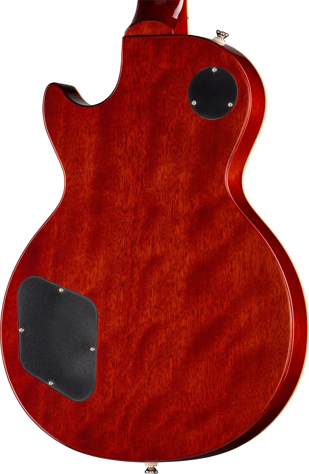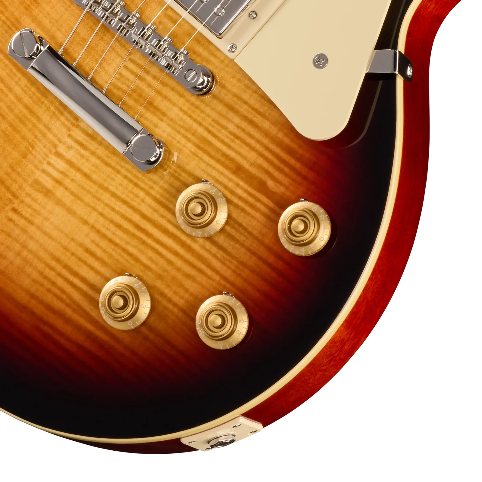 The Les Paul Standard 50s Figured is crafted with a mahogany body and a maple cap with a gorgeous, highly figured maple veneer, delivering the rich midrange punch of mahogany along with a touch of brightness from the maple cap, which is essential to the sonic signature of a Les Paul Standard. The highly figured maple veneer gives it the stunning looks of a far more expensive guitar. It also has a mahogany neck with a 1959 Rounded Medium C-profile and long neck tenon for exceptional stability and added sustain. The fretboard is now rosewood and features pearloid trapezoid inlays and 22 medium jumbo frets. The Kalamazoo headstock is equipped with Epiphone’s Vintage Deluxe tuners and a Graph Tech® nut, ensuring solid tuning stability, while the other ends of the strings pass over an Epiphone LockTone™ Tune-O-Matic™ bridge and are anchored with a LockTone Stop Bar tailpiece. The Les Paul Standard 50s is powered by a pair of critically acclaimed Epiphone ProBucker™ humbuckers™, with a ProBucker 1 in the neck position and a slightly hotter ProBucker 2 in the bridge for a balanced tone in all three switch positions. The pickups are wired to CTS® pots using 50s-style wiring, and the controls are topped with gold Top Hat knobs with dial pointers. A premium gig bag is also included. The Les Paul Standard 50s Figured is a fitting and accessible tribute to those legendary vintage Bursts that players at every stage can enjoy.