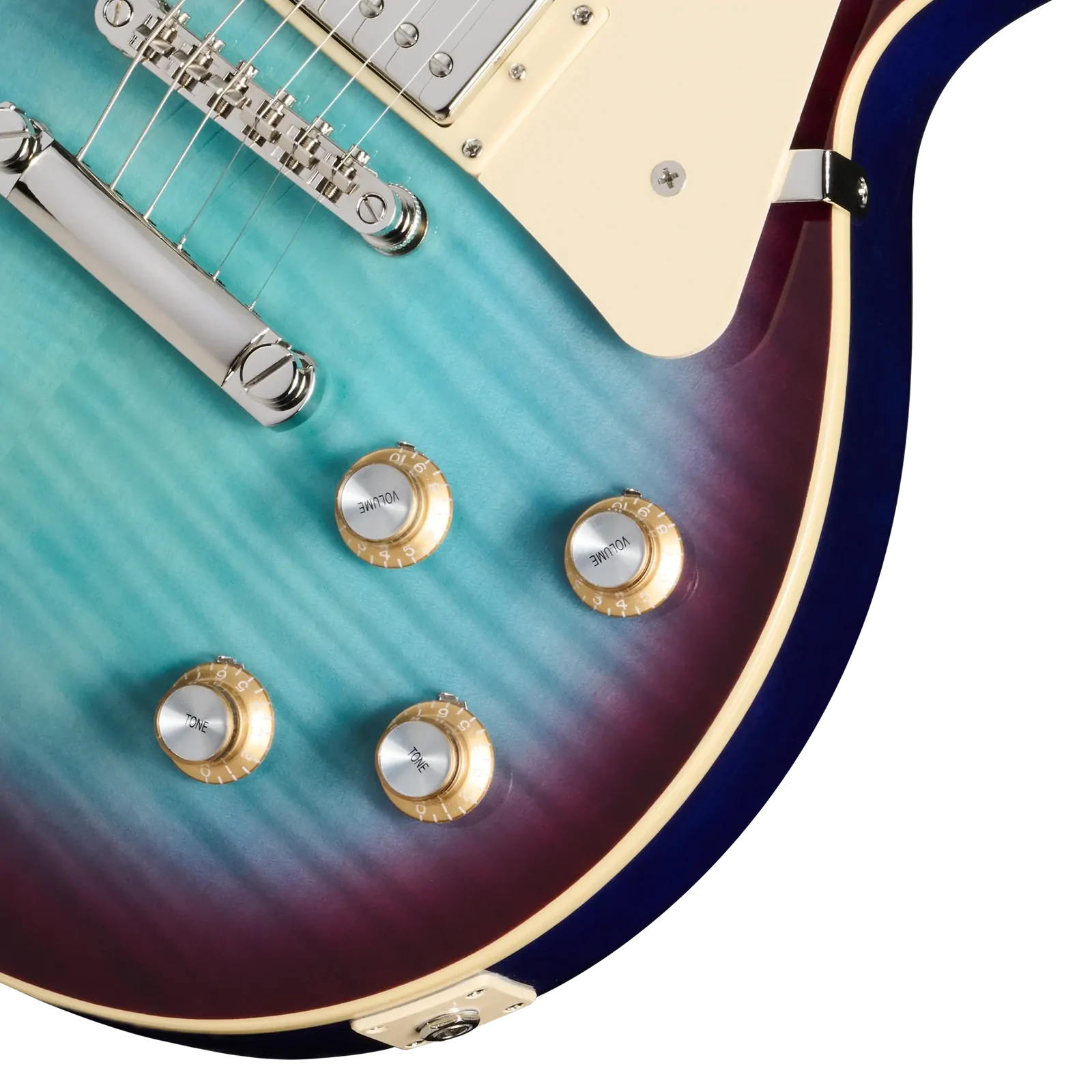 Epiphone’s long friendship with Mr. Les Paul began in 1940 when Les built one of the world’s first solidbody electric guitars while working nights at the original Epiphone factory in Manhattan. Les’s first solidbody guitar, nicknamed “the Log,” would go on to inspire the Les Paul Standard, which many consider the greatest electric guitar ever made. The Les Paul Standard 60s Figured is crafted with a mahogany body and a maple cap with a gorgeous, highly figured maple veneer, delivering the rich midrange punch of mahogany along with a touch of brightness from the maple cap, which is essential to the sonic signature of a Les Paul Standard. The highly figured maple veneer gives it the stunning looks of a far more expensive guitar. It also has a mahogany neck with a fast-playing SlimTaper 60s C-profile and long neck tenon for exceptional stability and added sustain. The fretboard is now rosewood and features pearloid trapezoid inlays and 22 medium jumbo frets. The 60s Kalamazoo headstock is equipped with quality Grover® Rotomatic® tuning machines and a Graph Tech® nut, ensuring solid tuning stability, while the other ends of the strings pass over an Epiphone LockTone™ Tune-O-Matic™ bridge and are anchored with a LockTone Stop Bar tailpiece. The Les Paul Standard 60s is powered by a pair of critically acclaimed Epiphone ProBucker™ humbuckers™, with a ProBucker 2 in the neck position and a slightly hotter ProBucker 3 in the bridge for a balanced tone in all three switch positions. The pickups are wired to individual volume and tone controls that feature high-quality CTS® potentiometers, and the controls are topped with gold Top Hat knobs with dial pointers. A premium gig bag is also included. The Les Paul Standard 60s Figured is a fitting and accessible tribute to those legendary vintage Bursts that players at every stage can enjoy.