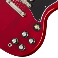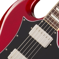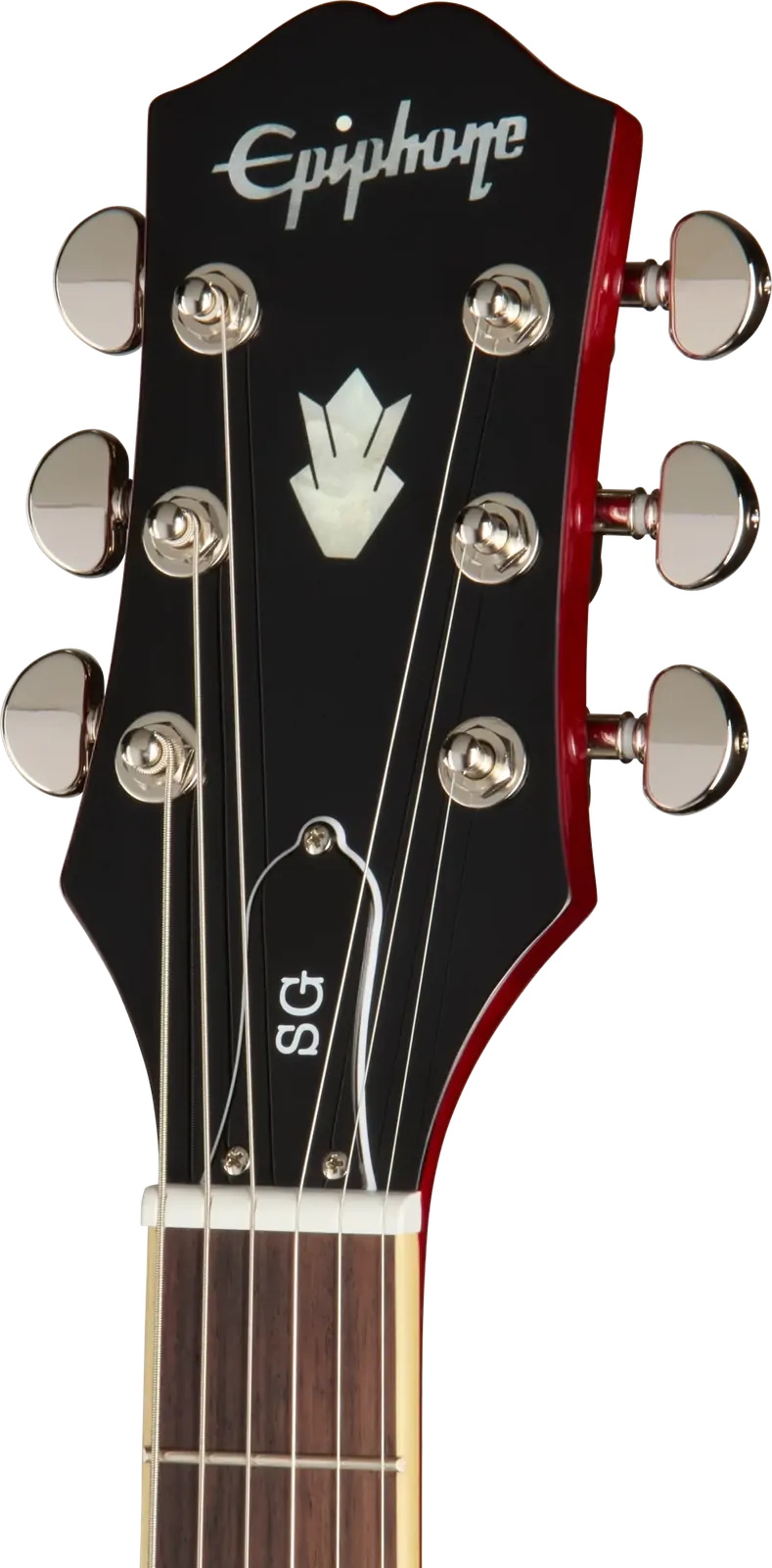 The Epiphone SG Standard features a contoured, double-cutaway mahogany body, providing unimpeded access to all 22 frets. The glued-in mahogany neck adds to the model’s renowned sustain. The neck has a fast-playing SlimTaper™ C profile and is capped with a bound rosewood fretboard, equipped with 22 medium jumbo frets, and adorned with pearloid trapezoid inlays. The fretboard’s 12” radius makes playing first-position chords easy while ensuring that string bends don’t fret out when you play them. High-quality Grover® Rotomatic® tuning machines and a Graph Tech™ nut, paired with a fully adjustable Epiphone LockTone™ Tune-O-Matic™ bridge and Stop Bar tailpiece, work together to maintain rock-solid tuning stability and intonation.