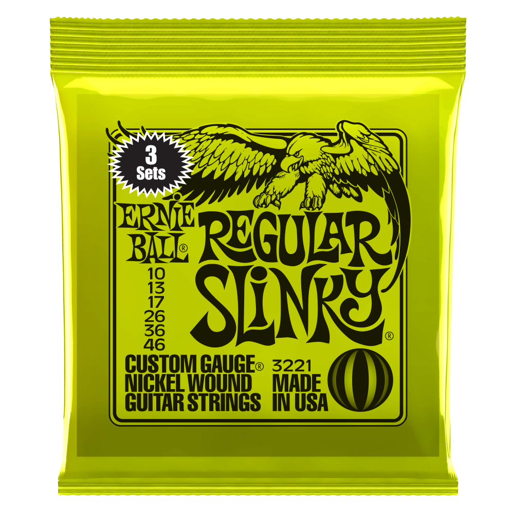 Now available in convenient three-set packs Ernie Ball Regular Slinky Electric Strings are our top selling set, and are favored by many musicians around the globe. Regular Slinky strings are played by Eric Clapton, John Mayer, Steve Vai and legions of guitar players worldwide These strings are precision manufactured to the highest standards and most exacting specifications to ensure consistency, optimum performance, and long life. Regular Slinky wound strings are made from nickel plated steel wire wrapped around a hex shaped steel core wire. The plain strings are made of specially tempered tin plated high carbon steel producing a well balanced tone for your guitar. Gauges .010, .013, .017, .026, .036, .046