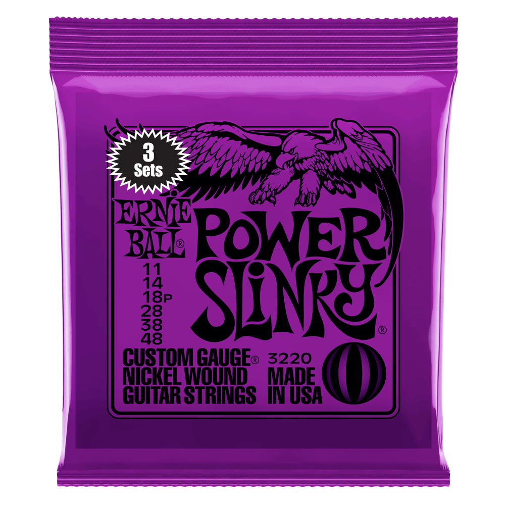 Ernie Ball Power Slinky Electric Strings are a perfect match for those who like chunky rhythms for rock and roll or blues Power Slinkys have long been favored by Slash, Metallica, and Kenny Wayne Shepherd due to the thicker gauge combination providing a slightly more powerful tone These strings are precision manufactured to the highest standards and most exacting specifications to ensure consistency, optimum performance, and long life Power Slinky wound strings are made from nickel plated steel wire wrapped around a hex shaped steel core wire The plain strings are made of specially tempered tin plated high carbon steel producing a well balanced tone for your guitar Gauges .011, .014, .018p, .028, .038, .048