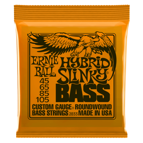 Ernie Ball Hybrid Slinky Bass sets are wound for a bright, balanced tone. Each bass string is manufactured with the finest and freshest raw materials in the beautiful Coachella Valley of Southern California. The list of endorsers for Ernie Ball Slinky bass strings reads like a who's who of top selling artists. Gauges .045, .065, .085, .105