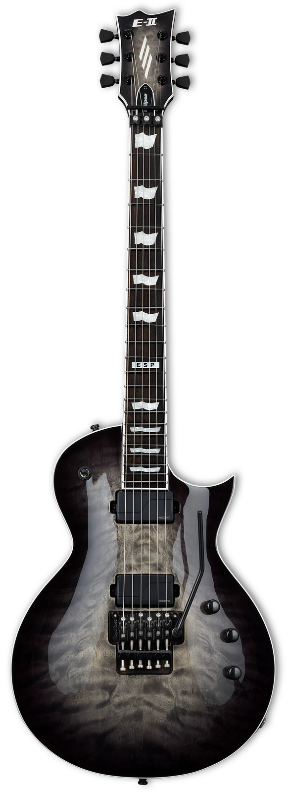Formerly known as “ESP Standard”, ESP E-II instruments are made in Japan at the ESP factory. This outstanding Eclipse model has it all… the comfortable single-cutaway Eclipse body shape, a set of Fishman Fluence Modern Humbucker pickups, and a Floyd Rose Original that’s been upgraded with stainless steel screws. Built at the traditional 24.75” scale with set-thru construction for smooth, fast access to the highest frets, this E-II Eclipse FR has a mahogany body with figured quilted maple top, a mahogany neck, and ebony fingerboard with pearloid ESP flag inlays and 22 extra-jumbo stainless steel frets. The back of the neck is satin finished for the ultimate in smooth playing feel. Other features include black hardware, Gotoh locking tuners, ESP strap locks, and a set of Fishman Fluence Modern Humbucker active pickups with individual volume knobs and a push-pull control on the tone knob to select pickup voicings. Includes ESP deluxe hardshell case.