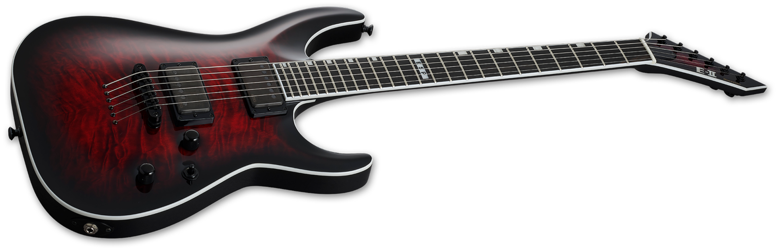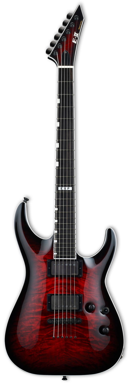 With its arched top and premier-quality construction and components, the E-II Horizon NT-II is ready for professional-level stage and studio performances for all kinds of music. Formerly called “ESP Standard”, all ESP E-II instruments are created at our ESP factory in Tokyo, Japan, and are designed for professional players who accept no compromises in tone, feel, or reliability for their guitars and basses. The E-II Horizon NT-II is available in See Thru Black Cherry Sunburst, and features neck-thru-body construction with a mahogany body and arched quilted maple top, and a three-piece maple neck that features an ebony fingerboard with 24 extra-jumbo frets and offset block inlays, and a satin finish on the back for super smooth playability. This guitar offers high-end components that include Gotoh locking tuners, a Gotoh TOM bridge and tailpiece, a bone nut, and Dunlop locking strap buttons. Pickups on the E-II Horizon FR-II are EMG 66TW (neck) and EMG 57TW (bridge), both with Brushed Black Chrome covers and coil splitting with push-pull controls. Includes an ESP hardshell form-fitting case.