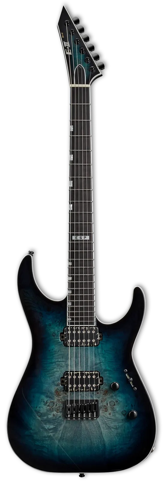 Formerly known as “ESP Standard”, ESP E-II instruments are made in Japan at the ESP factory. With the E-II M-II Mercury Blueburst, you’re getting a powerhouse of a guitar that’s ready to impress, both visually and sonically. This guitar features set-thru construction at 25.5” scale for fast and easy access to the highest frets. Its alder body features a burled maple top with figured wood grain and knots that look incredible under its translucent finish. Its three-piece maple neck is satin-finished on the back for the ultimate in smooth playing feel. Its ebony fingerboard features pearloid offset block inlays and 24 extra-jumbo stainless steel frets. White binding accents the guitar’s top, headstock, and neck. The E-II M-II Mercury Blueburst offers a set of premium-quality components like a Hipshot hardtail bridge with string-thru-body, Gotoh locking tuners, a bone nut, and ESP strap locks. This outstanding guitar also features a set of direct-mounted Bare Knuckle Aftermath pickups with black Battleworn covers, offering accelerated bass response for exceptionally fast tracking of high-speed staccato riffing, and delivering a crushing midrange and precise high-end articulation. A push-pull tone control allows for coil splitting. Includes ESP deluxe hardshell case.