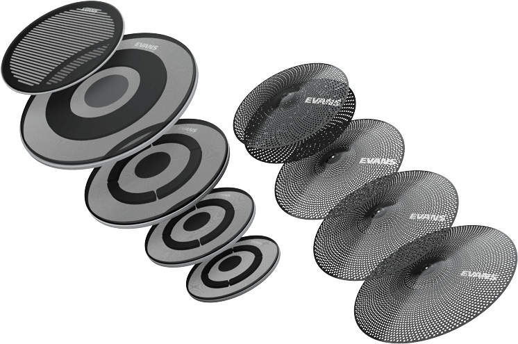 Evans dB One Rock System Pack + Cymbals offers you unprecedented freedom to play how you want, when you want. This pack features three dB One tom heads (10”, 12”, and 16”) and a 22” bass drumhead which, utilizing several Evans breakthroughs, remain faithful to your kit’s tone while generating 80% less volume. The included 14” dB One snare head combines our ShockWeave Mesh with new Snare Sim technology to keep the noise low, while replicating the buzz, crack, and excitement of an acoustic snare. Additionally, this pack comes with the full array of dB One Cymbals, which achieve authentic chime and resonance, at a fraction of the volume.