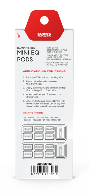 Sculpt your sound with EVANS EQ Pods, the ultimate solution to overtone, tuning, and resonance control. These polymer gels feature a Teflon-coated top side, helping them to remain stain-free and hold their shape. Designed for experimentation, you can apply and remove without surrendering grip, shape, or effectiveness.