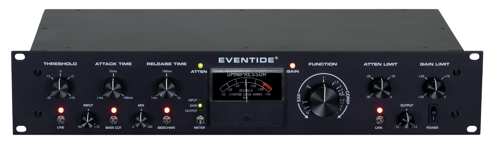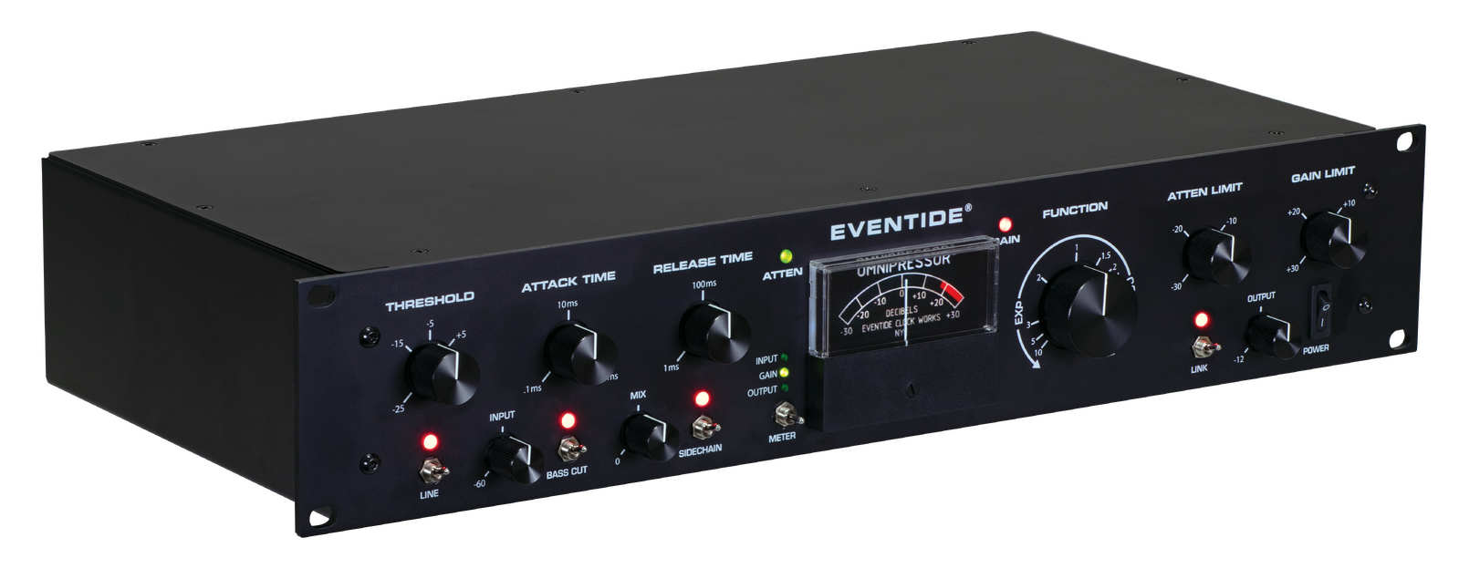 The 50th anniversary Model 2830*Au Omnipressor® is a professional-quality dynamic modifier, combining the functions of an analog compressor, expander, noise gate, and limiter in one convenient package. Its dynamic reversal feature makes high-level input signals lower than corresponding low-level inputs. Musically, this reverses the attack-decay envelope of plucked strings, drums, and similar instruments and gives the effect of “talking backward” when applied to a voice signal.