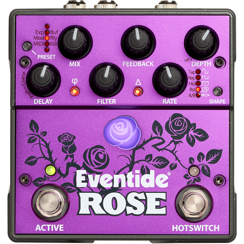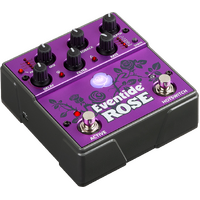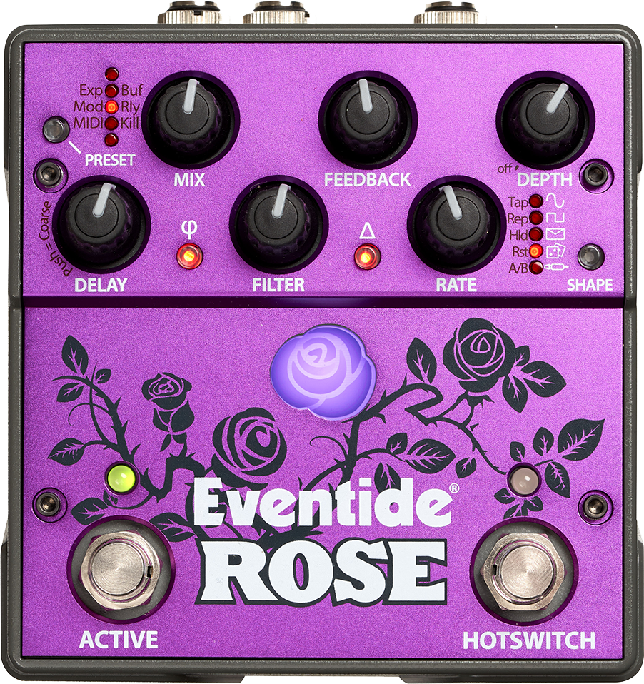 From reverse delays, slapback, chorus, and everything in between, Rose is capable of producing a wide range of sounds. The perfect hybrid of analog and digital, the pedal features five different modulation sources, delay multiplier, phase invert/reverse, 25 customizable presets, true analog dry path, MIDI, and AUX/Expression via TRS for ultimate versatility, on stage or in the studio.