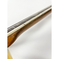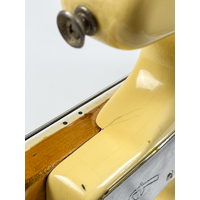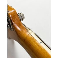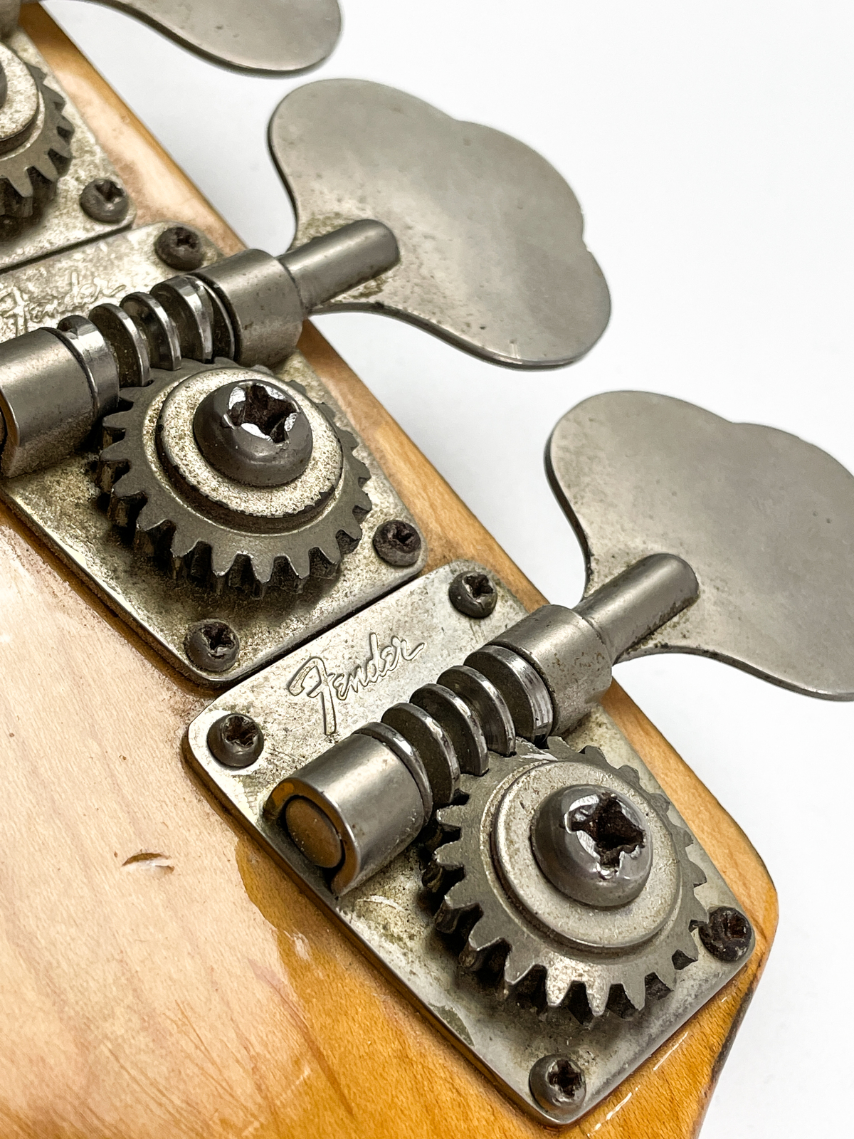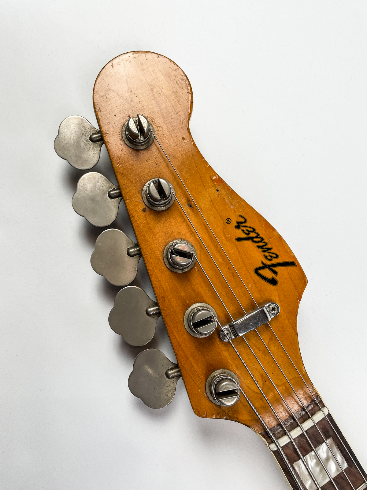 The neck remains playable with a functional truss rod. Signs of wear and tear however, are present. The binding surrounding the fretboard has multiple fractures and what appears to be a repair undertaken on the treble side of the fretboard where some rosewood has been chipped away. A resin epoxy seems to have been used to fill the void, however this does not affect playability, as it has been matched to the fretboard radius. Additionally the truss rod adjuster has been replaced and in the process it appears that a small chip of binding has been lost. The frets are original, and while playable it should be noted that they are on the low/worn side. The pearloid block inlays within the veneer rosewood fretboard are a combination of original and replacements. A replacement bone nut has been installed. The whole of the neck has been over sprayed with original finish underneath, there is timber discolouration, underneath the new finish and the odd spot here and there showing some “paint sag” at the headstock transition, likely the result of an overly heavy handed approach to the process. It is however fully cured and does not feel tacky under hand. The headstock shows signs of the overspray more than anywhere else, however the face of the headstock remains finish wise - original, with the simple Fender logo, and no model name - in line with the mid 1966 issue of the Bass V. The machine heads are original and fully functional. An additional string guide may have been installed and later removed, the original guide remains in place.
