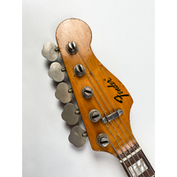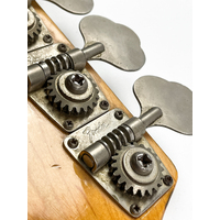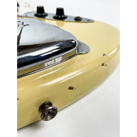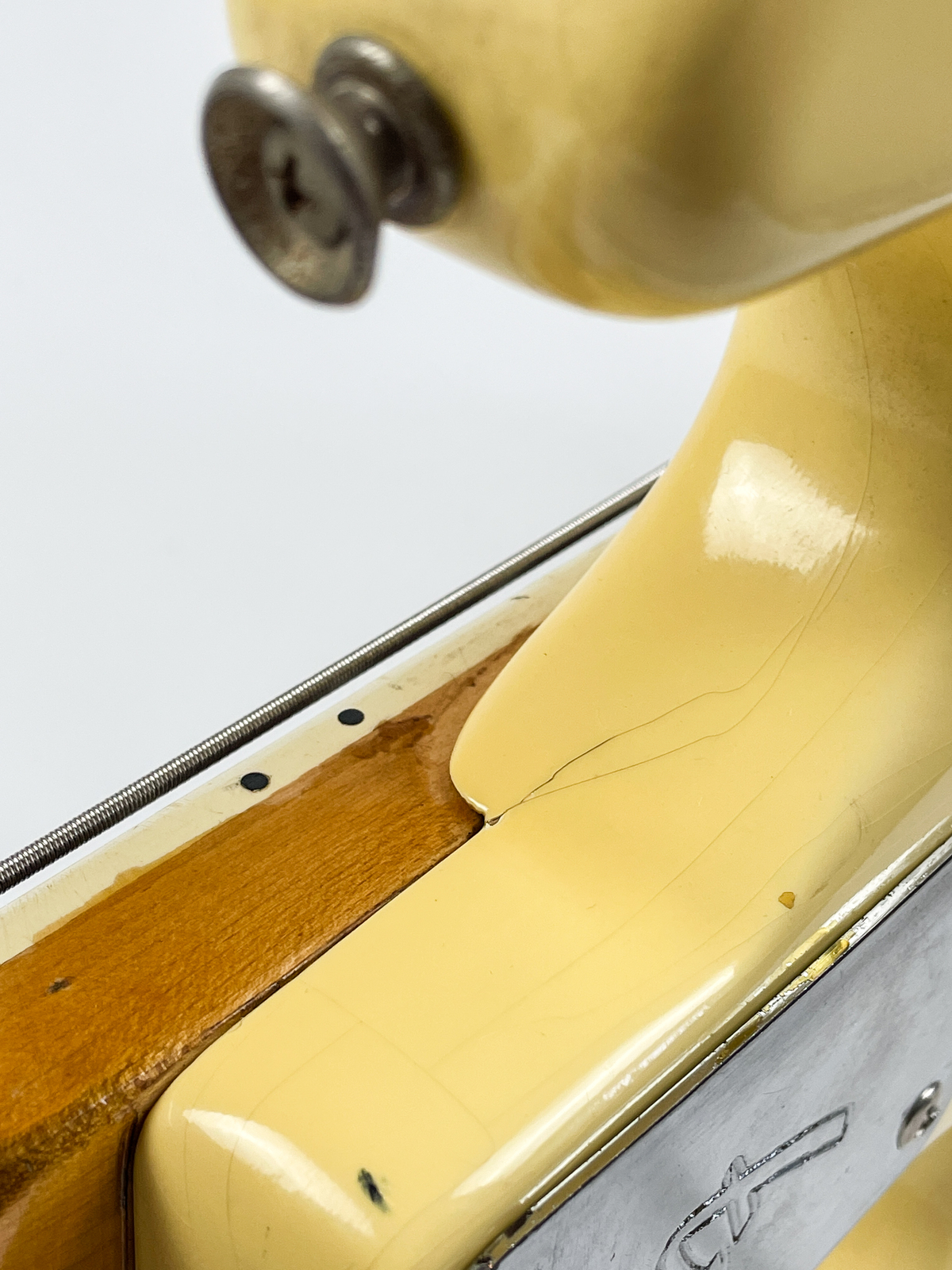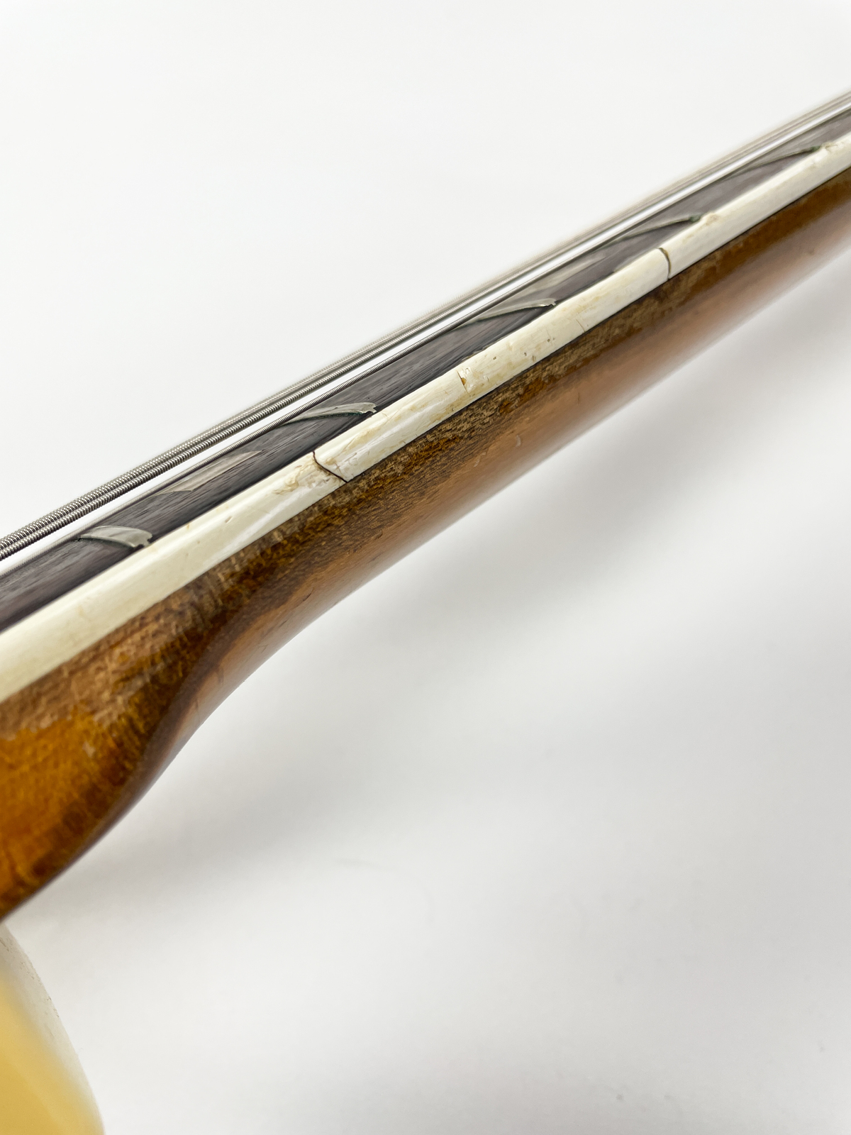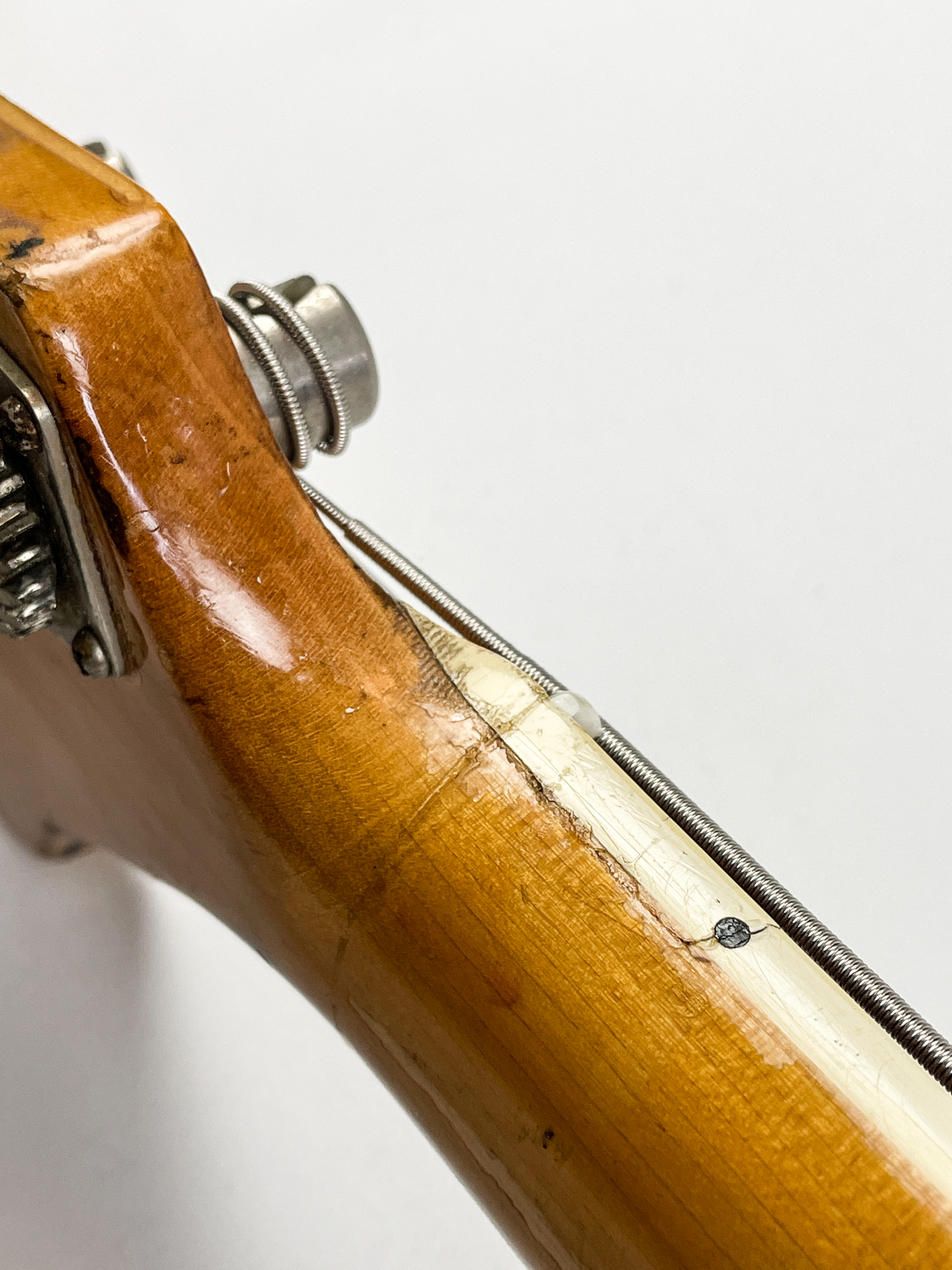 The neck remains playable with a functional truss rod. Signs of wear and tear however, are present. The binding surrounding the fretboard has multiple fractures and what appears to be a repair undertaken on the treble side of the fretboard where some rosewood has been chipped away. A resin epoxy seems to have been used to fill the void, however this does not affect playability, as it has been matched to the fretboard radius. Additionally the truss rod adjuster has been replaced and in the process it appears that a small chip of binding has been lost. The frets are original, and while playable it should be noted that they are on the low/worn side. The pearloid block inlays within the veneer rosewood fretboard are a combination of original and replacements. A replacement bone nut has been installed. The whole of the neck has been over sprayed with original finish underneath, there is timber discolouration, underneath the new finish and the odd spot here and there showing some “paint sag” at the headstock transition, likely the result of an overly heavy handed approach to the process. It is however fully cured and does not feel tacky under hand. The headstock shows signs of the overspray more than anywhere else, however the face of the headstock remains finish wise - original, with the simple Fender logo, and no model name - in line with the mid 1966 issue of the Bass V. The machine heads are original and fully functional. An additional string guide may have been installed and later removed, the original guide remains in place.