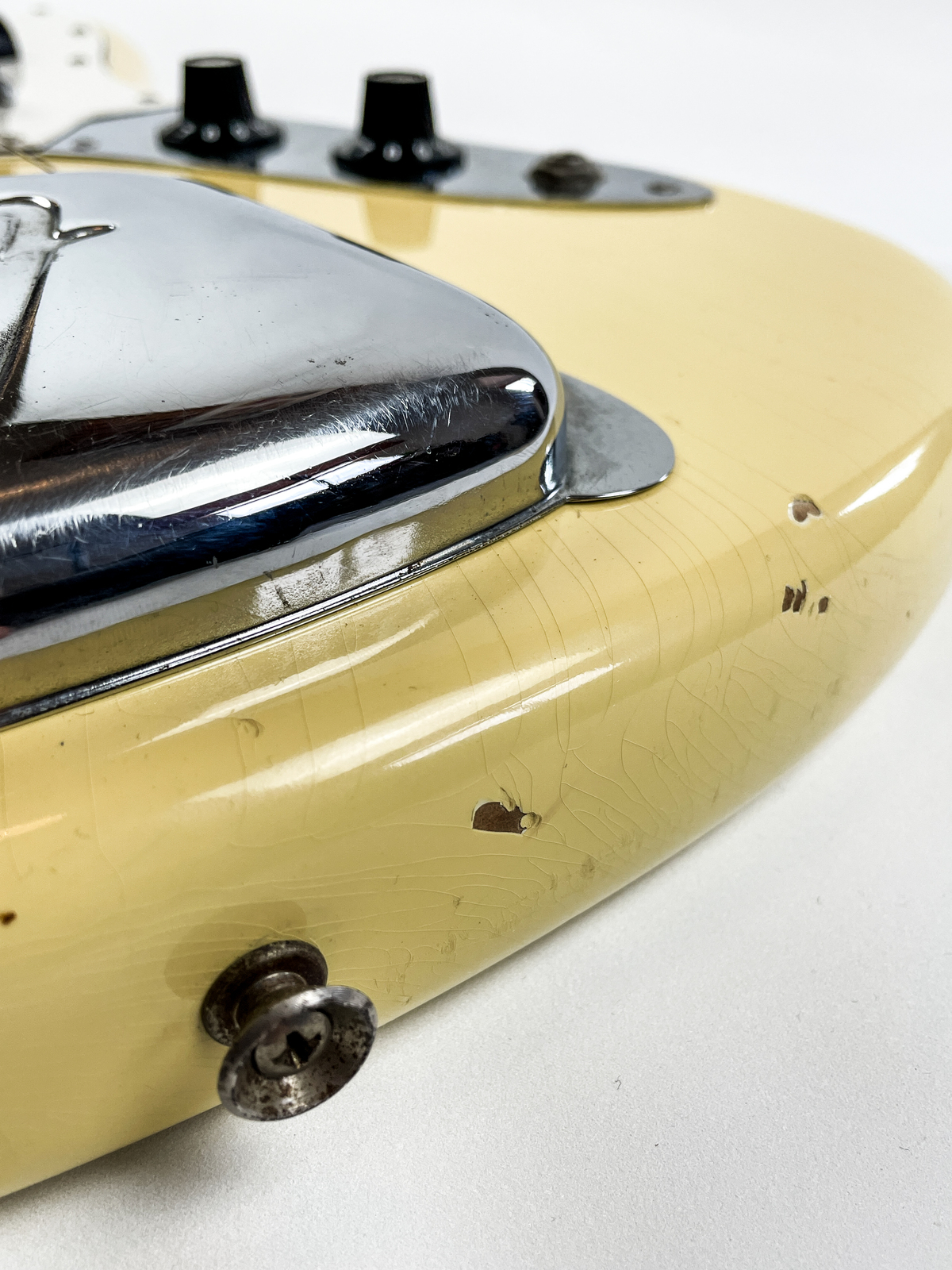 The pickups and wiring harness are original to this instrument, with two 250K CTS pots (volume & tone) dating to the 42nd week of 1966, complimented with original jack and ceramic disc capacitor. The split design single coil pickups are dated to the mid 1960’s though the last year is rather difficult to accurately date, and both the pickup and control cavities have the original shields in place. The control wiring is a mix of original vintage cloth, and poly coated replacement, the pickup wiring is all original.
