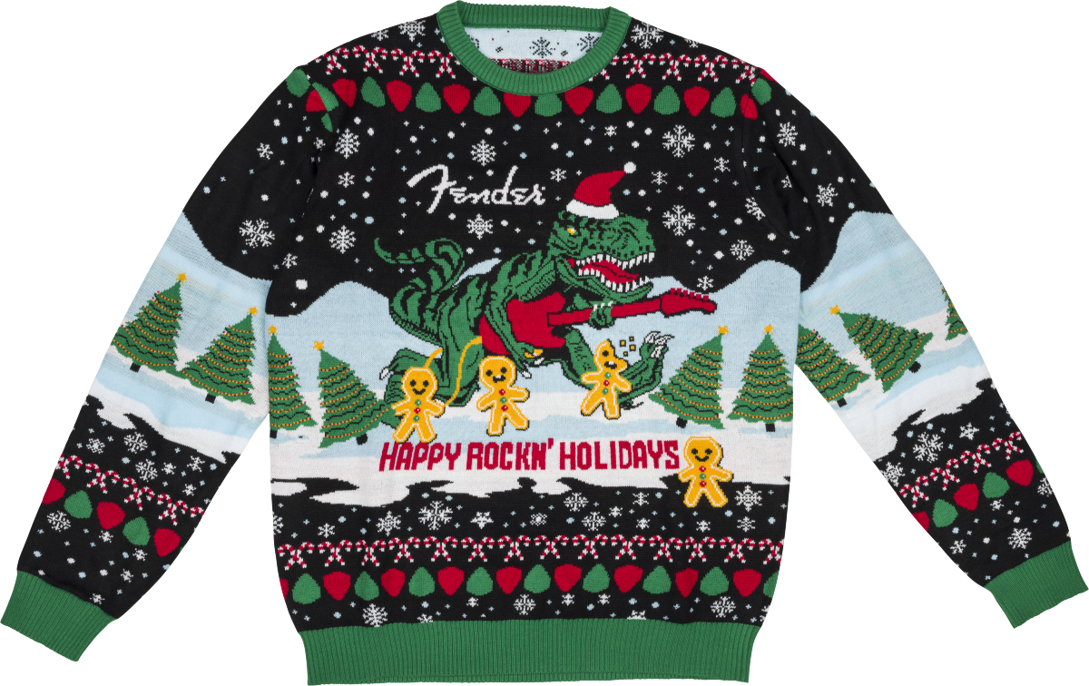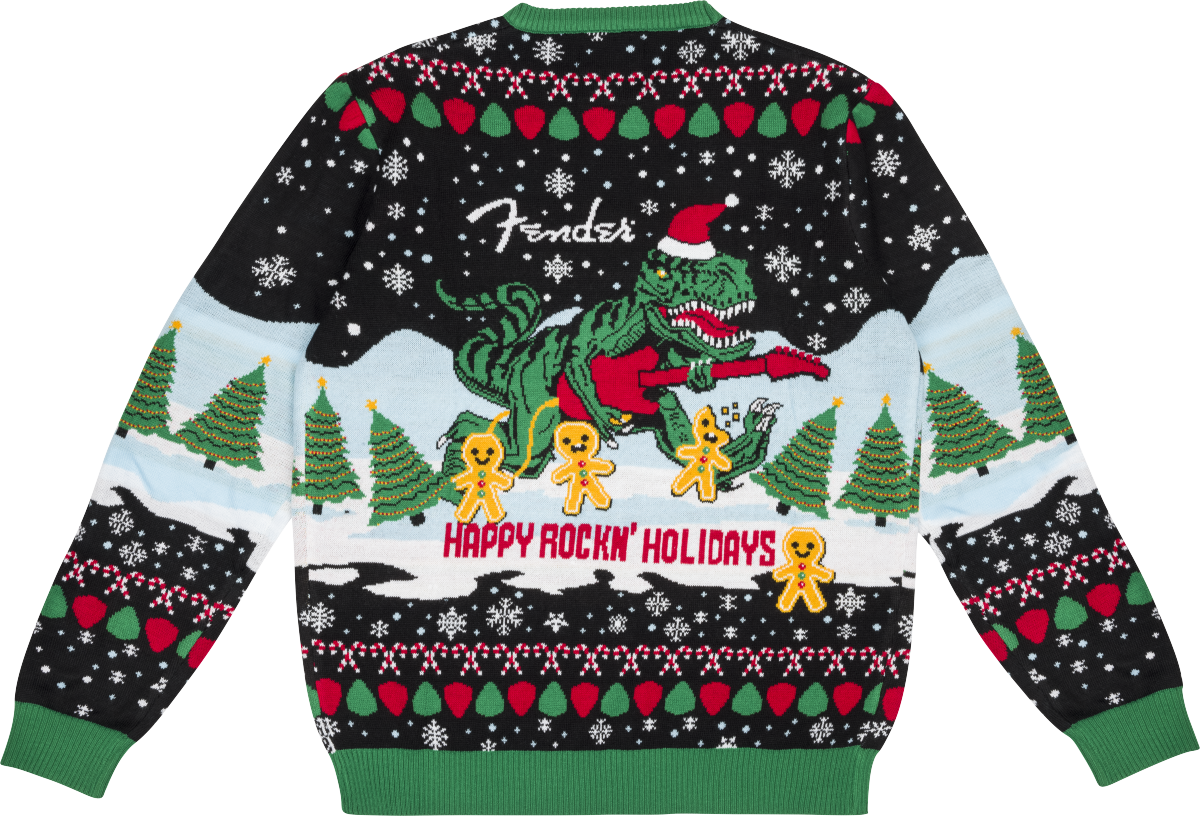 Fender's "TELEREX" Ugly Christmas Sweater will be the hit of your next holiday party, family gathering or gift giving rendezvous. You are sure to win the next Ugly Christmas Sweater contest in your "TELEREX" sweater and beanie. Rock On all you Holiday Elves. Oh what fun it is!