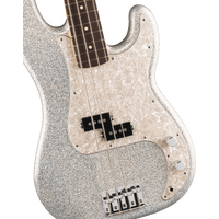 Experience modern craftsmanship with a touch of sparkle in the Player II Precision Bass. Crafted with a resonant alder body finished in eye-catching Diamond Dust Sparkle, this instrument delivers both style and substance. The Modern "C" shaped maple neck with 9.5" radius rosewood fingerboard, rolled edges, and medium jumbo frets provide the smooth, comfortable playability that today's players crave. The 75th Anniversary Thunderbolt™ Precision Bass® pickup delivers rich, powerful tones with enhanced clarity and punch that cuts through any mix. Other quality appointments include a 4-Saddle Bridge with Single-Groove Steel “Barrel” Saddles, open-gear tuning machines and a 4-ply pearloid pickguard with chrome hardware throughout. This exceptional 75th Anniversary Player II Sparkle Precision Bass combines contemporary appointments with a premium sparkle finish, perfect for players who want to stand out while delivering that legendary P-Bass sound.