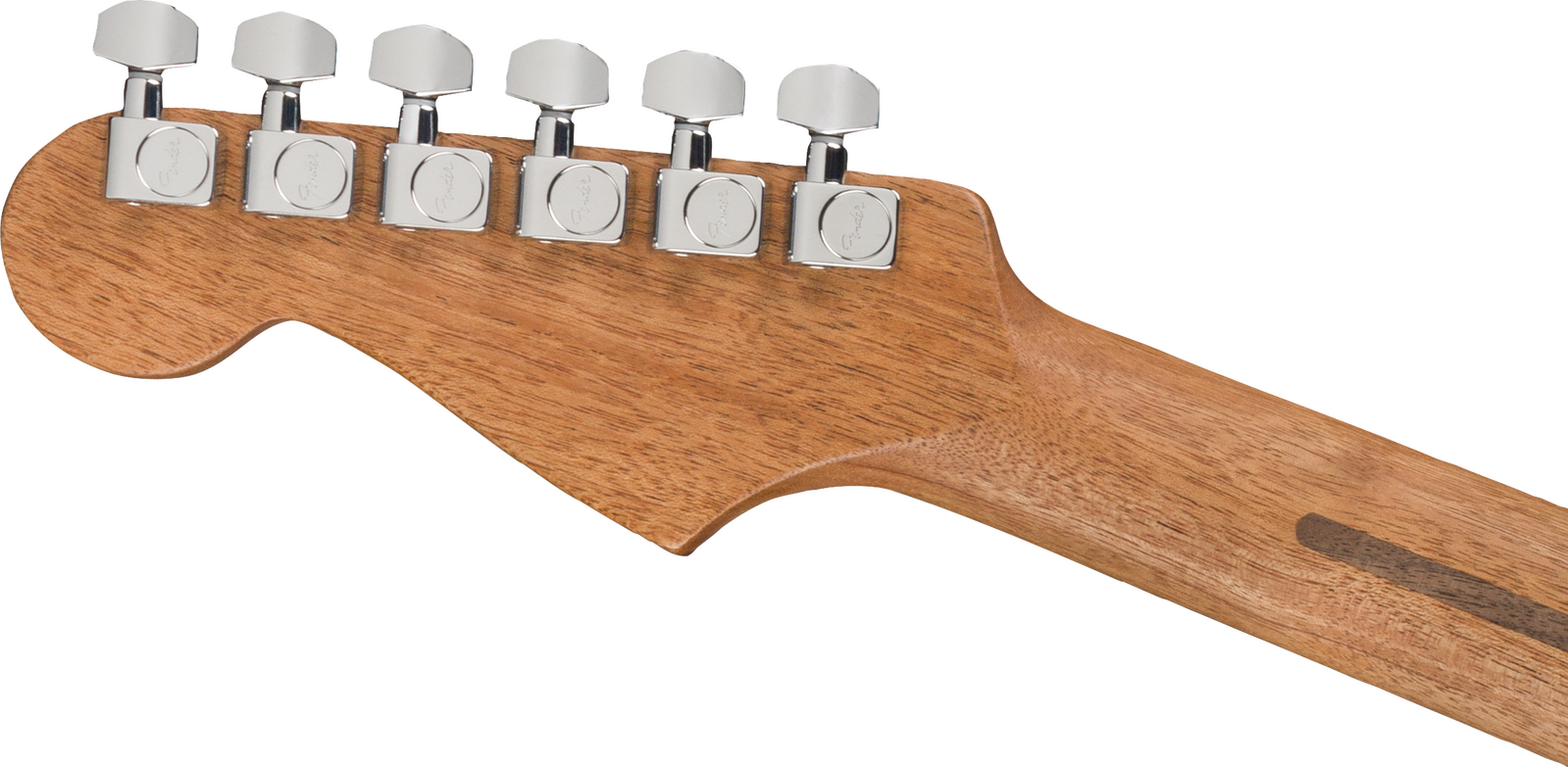 The mahogany Stratocaster neck with ebony fingerboard offers a familiar playing feel and adds warmth to the guitar’s tone.