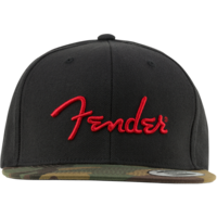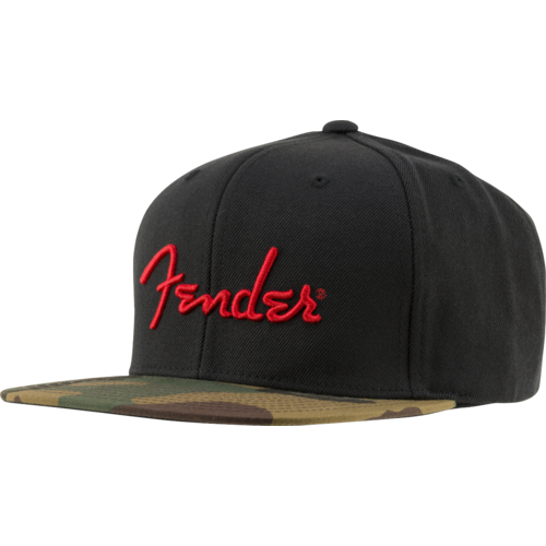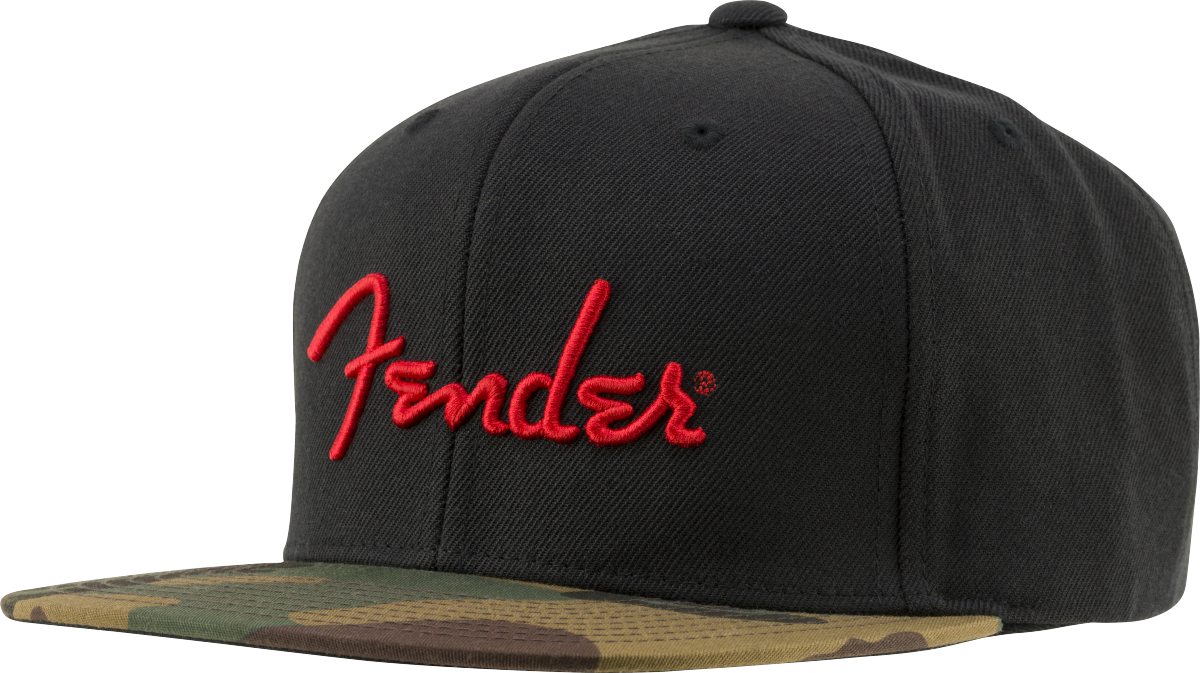 This flatbill cap is for the bold Fender fan. Featuring our “spaghetti” logo embroidered in red over black panels, this hat sports a cool camo bill.