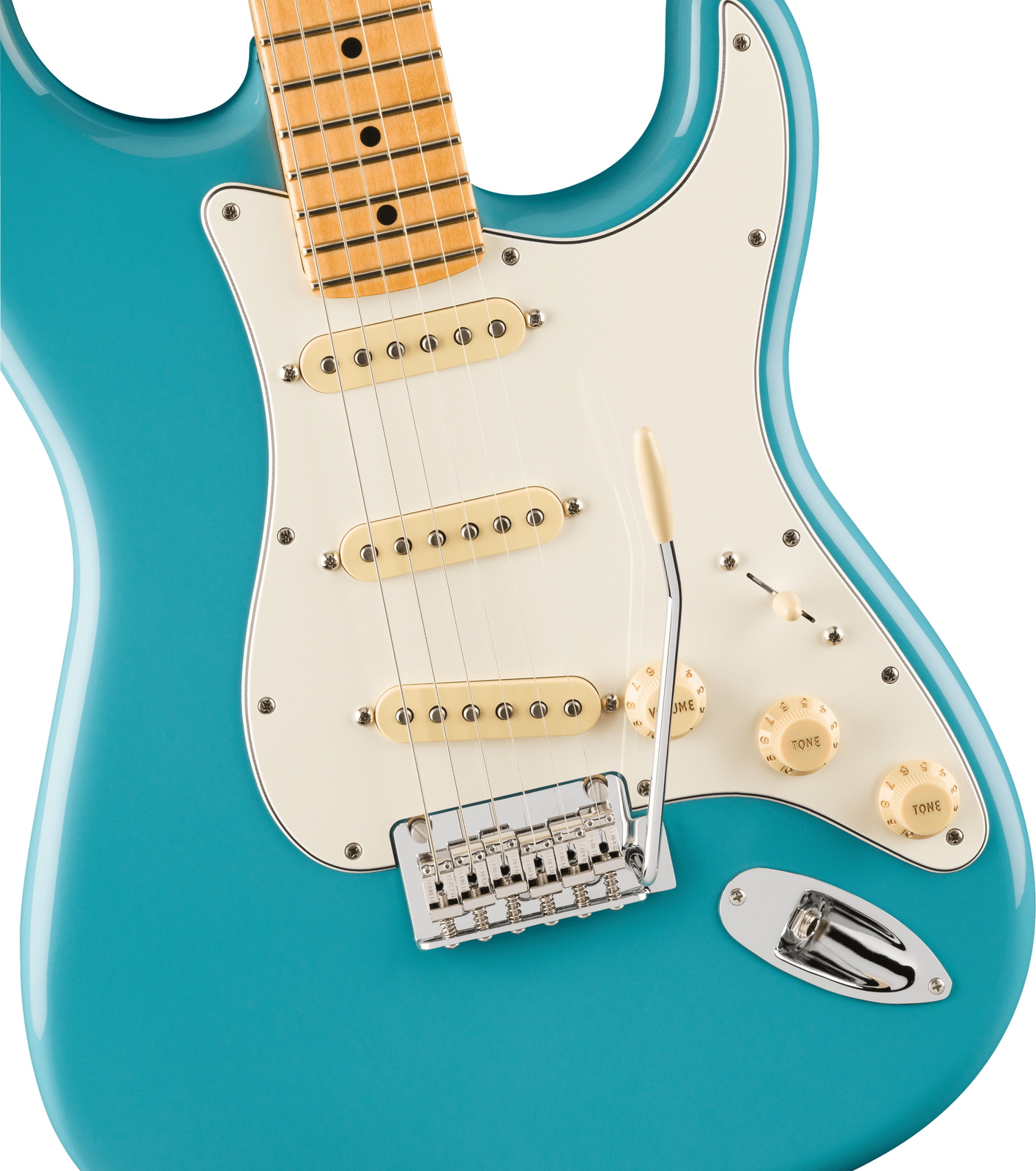 This Stratocaster features a two-point Synchronized Tremolo with bent steel saddles for definitive Strat tone with superior tremolo action for the most expressive vibrato and most daring dive bombs.