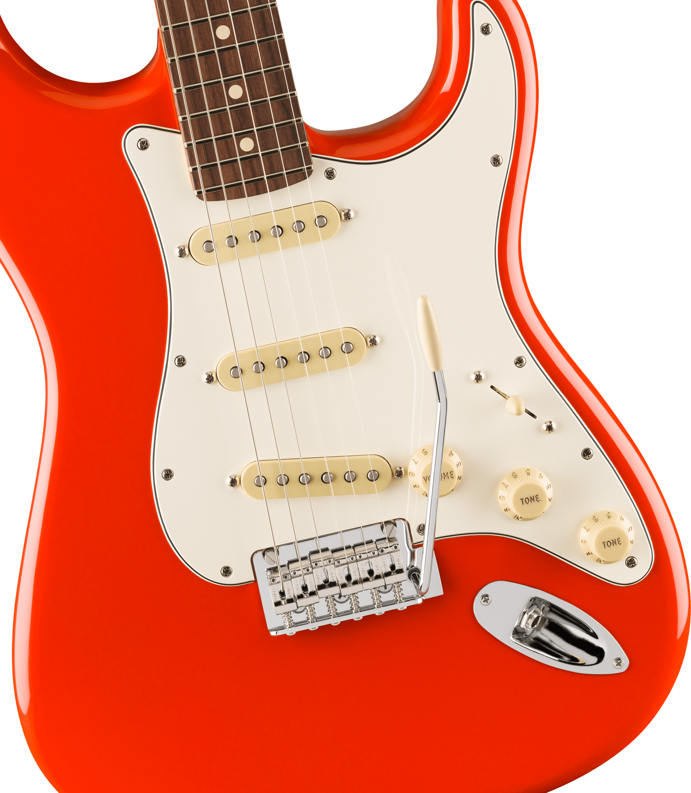 This Stratocaster features a two-point Synchronized Tremolo with bent steel saddles for definitive Strat tone with superior tremolo action for the most expressive vibrato and most daring dive bombs.
