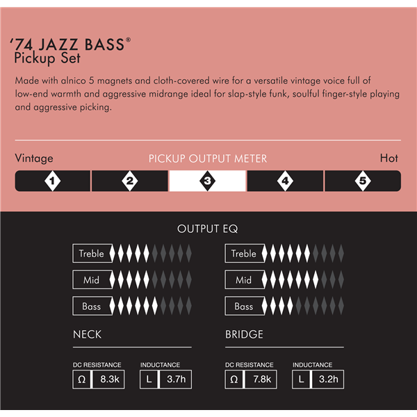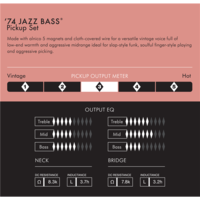 With a versatile vintage voice full of low-end warmth and their distinct midrange, Fender's Pure Vintage '74 single-coil Jazz Bass pickups are the ideal solution for the bass player who prefers slap-style funk, soulful fingerstyle playing and aggressive pickups.