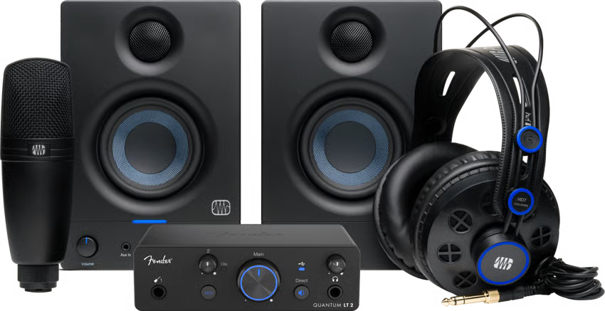 Everything you need to record, produce, and monitor music — from interface to mic to speakers — in one complete package.