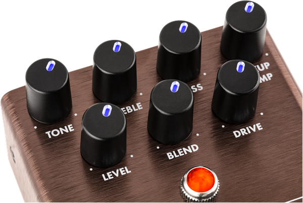 Designed by our in-house team of experts, the Smolder® Acoustic Overdrive is an all-original Fender circuit. The chassis is crafted from lightweight, durable anodized aluminum, and the Amp Jewel LED gives your pedalboard the classic Fender look. The switchable LED-backlit knobs show your control settings on a dark stage at a glance.