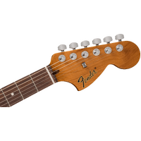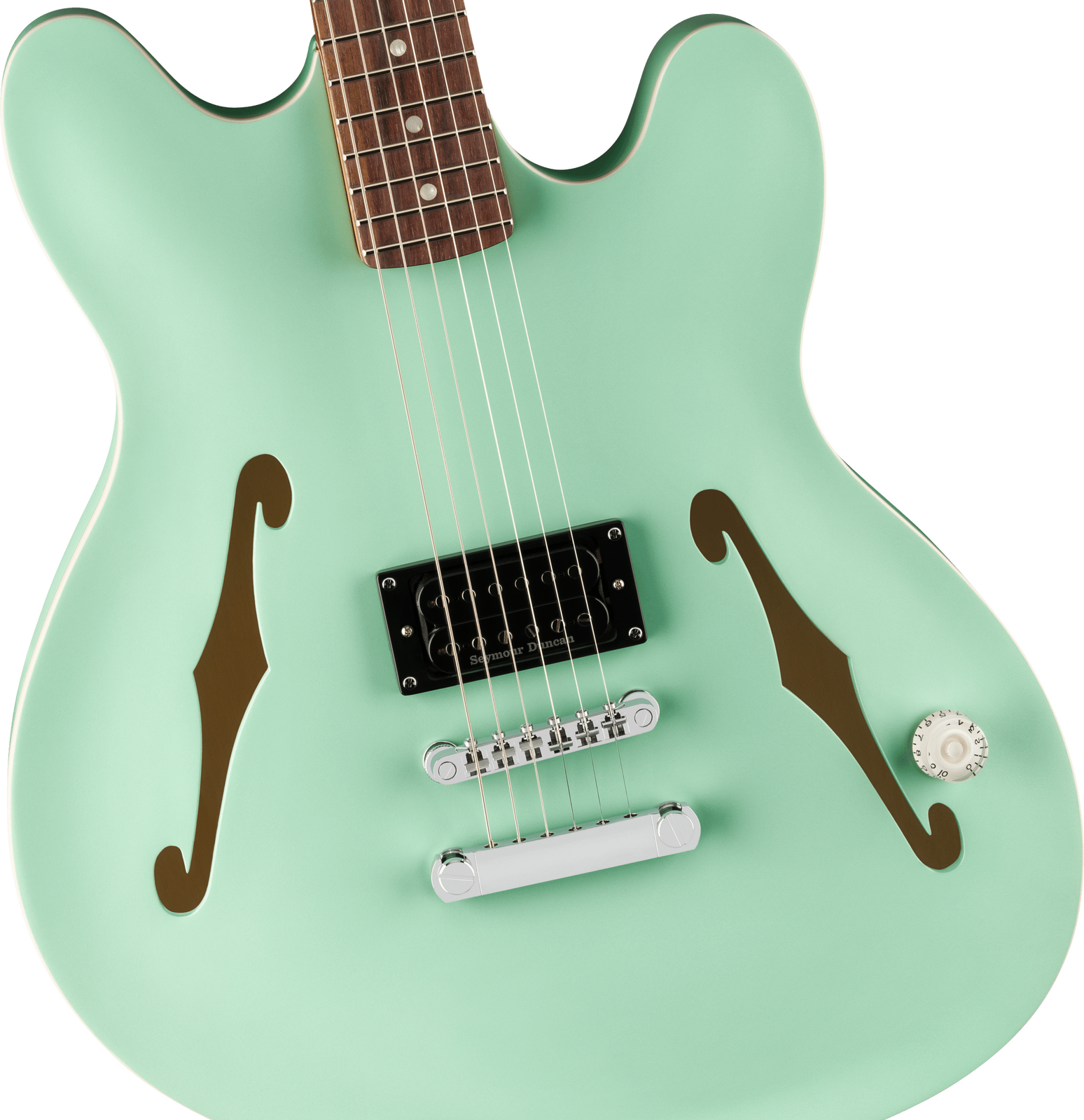 Designed with an offset semi-hollow body, the Tom DeLonge Starcaster boasts a Seymour Duncan® SH-5 Duncan Custom™ humbucker for turbo-charged tone that’s perfect for chunky power chords and crunchy riffs. But it's not all about power — the streamlined control setup consisting of a single master volume combined with a treble bleed circuit preserves the guitar’s natural high-end, ensuring sparkly cleans and chime-y edge-of-breakup tones. The comfy modern "C" neck features medium jumbo frets on a 12"-radius rosewood fingerboard for a modern feel with superior playability. Other highlights include Fender locking tuners for rock-solid tuning stability and fully adjustable bridge with stop tailpiece for classic looks, superior setup adjustment and enhanced tuning stability. DeLonge’s original signature artwork is featured on the back of the headstock and custom crafted neck plate.