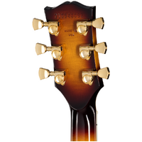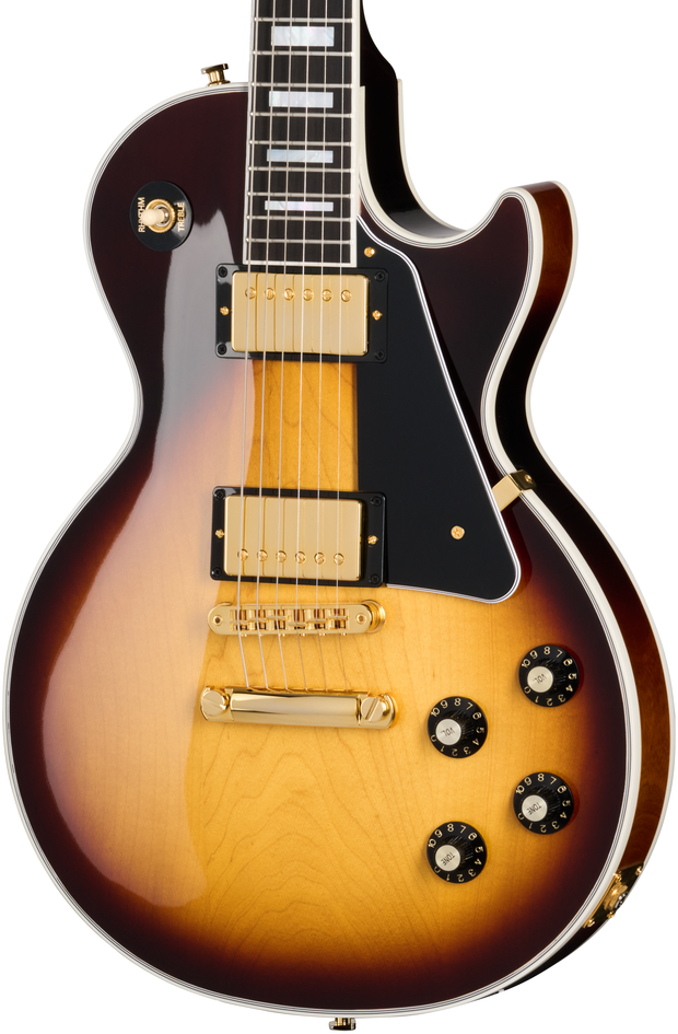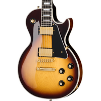 It features classic 1970s specs, including a mahogany body with a three-piece maple top. The body is bound with 5-ply top binding and 3-ply back binding. The maple neck has a 70s profile and a volute and is topped with a bound ebony fretboard with 22 medium jumbo frets and mother-of-pearl block inlays. The bound headstock is also adorned with mother-of-pearl in the form of the famous Custom Split Diamond headstock inlay, which originated with the Gibson Super 400 and has become synonymous with the Les Paul Custom. The Les Paul Custom 70s features gold hardware, including an aluminium Nashville Tune-O-Matic bridge, an aluminium Stop Bar tailpiece, and smooth-turning Grover® Rotomatic® with Keystone button tuners for reliable tuning stability.