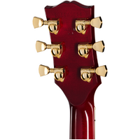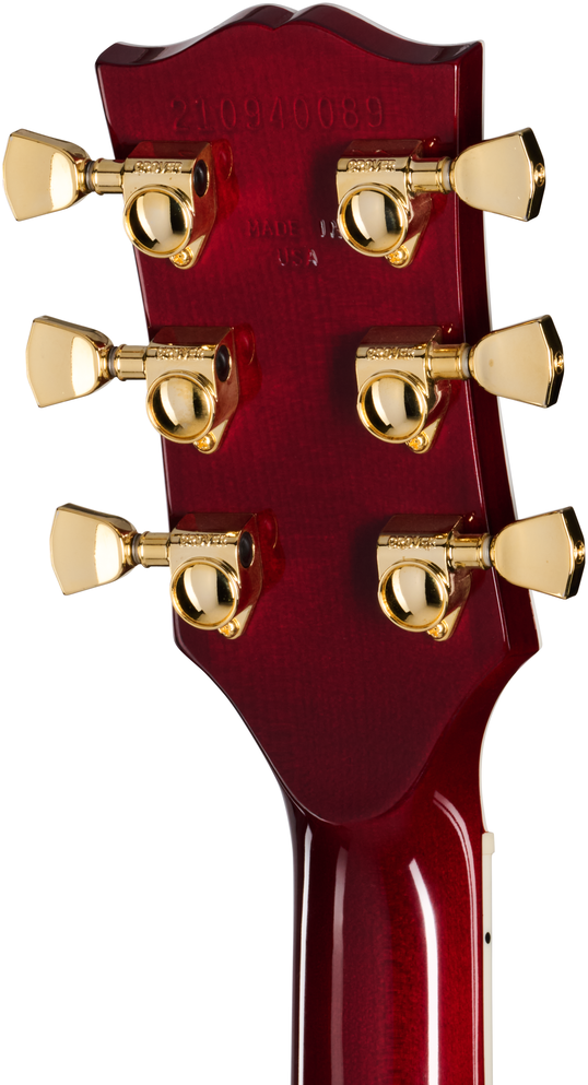 It features classic 1970s specs, including a mahogany body with a three-piece maple top. The body is bound with 5-ply top binding and 3-ply back binding. The maple neck has a 70s profile and a volute and is topped with a bound ebony fretboard with 22 medium jumbo frets and mother-of-pearl block inlays. The bound headstock is also adorned with mother-of-pearl in the form of the famous Custom Split Diamond headstock inlay, which originated with the Gibson Super 400 and has become synonymous with the Les Paul Custom. The Les Paul Custom 70s features gold hardware, including an aluminium Nashville Tune-O-Matic bridge, an aluminium Stop Bar tailpiece, and smooth-turning Grover® Rotomatic® with Keystone button tuners for reliable tuning stability.