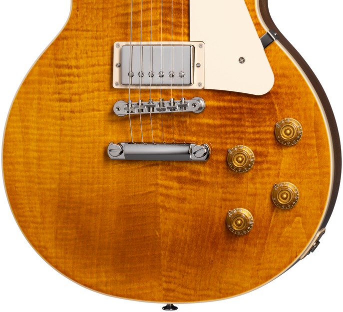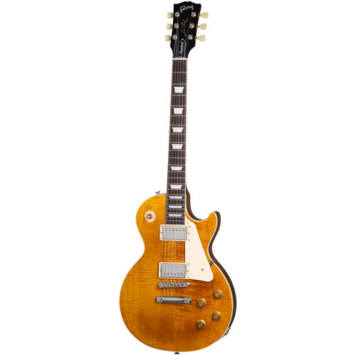 The Les Paul Standard 50's Figured returns to the classic design that made it relevant, played, and loved - shaping sound across generations and genres of music. It pays tribute to Gibson's Golden Era of innovation and brings authenticity back to life. It boasts a solid mahogany body, an AA-figured maple top, and a distinctive translucent custom color nitrocellulose lacquer finish that showcases the figured maple top. The mahogany neck has a rounded 50s-style profile and a rosewood fingerboard with trapezoid inlays. The Les Paul Standard 50's Figured is equipped with an ABR-1, the classic-style Tune-O-Matic bridge, an aluminum Stop Bar tailpiece, Vintage Deluxe tuners with Keystone buttons, and aged gold Top Hat knobs. The calibrated Burstbucker 1 (neck) and Burstbucker 2 (bridge) pickups are loaded with Alnico 2 magnets and wired to audio taper potentiometers and Orange Drop® capacitors. A hardshell case is also included.